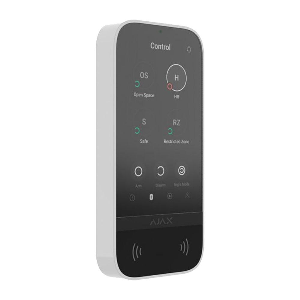 KeyPad Touchscreen Jeweller бездротова клавіатура з сенсорним екраном для керування системою Ajax. Сенсорний IPS-дисплей з діагоналлю 5 дюймів з роздільною здатністю 480 x 854 пікселів. Екран захищений від потертостей і подряпин. Підсвічування вдень яскраве, вночі не засліплює. Підтримка захищених карток і брелоків пристрою доступу Pass і Tag. Керування зі смартфона завдяки підтримці BLE. Дальність зв'язку з хабом Ajax до 1700 м. Звукові сповіщення про затримки, відкриття дверей і тривоги. Легке керування групами охорони. Окрема вкладка для керування пристроями автоматизації. До 99 кодів доступу. Сумісні хаби та ретранслятори Hub 2 (2G), Hub 2 (4G), Hub 2 Plus, Hub Hybrid (2G), Hub Hybrid (4G), ReX 2. Змінні батареї AA. До 1,5 року роботи від попередньо встановлених батарей.