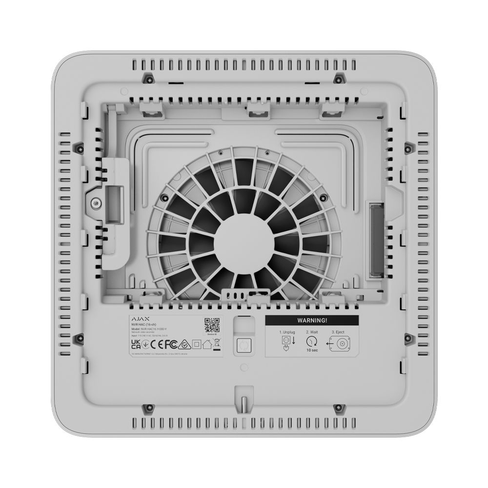 Ajax NVR HAC (16-ch) white — мережевий відеореєстратор з підтримкою IP-камер Ajax та інших виробників, сумісних з ONVIF і RTSP. Оснащений HDMI-виходом, двома USB 2.0, Ethernet-роз'ємом і можливістю встановлення жорсткого диска до 16 ТБ. Підтримує роздільну здатність до 12MP, пропускну здатність вхідного потоку 80 Мбіт/с і одночасне відтворення до 16 каналів. Робоча температура — від 0 до +40 °C, енергоспоживання — до 24 Вт, корпус з активним охолодженням. Передбачена інтеграція в професійні системи відеоменеджменту та захист приватності даних.