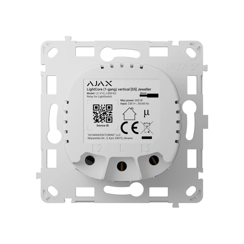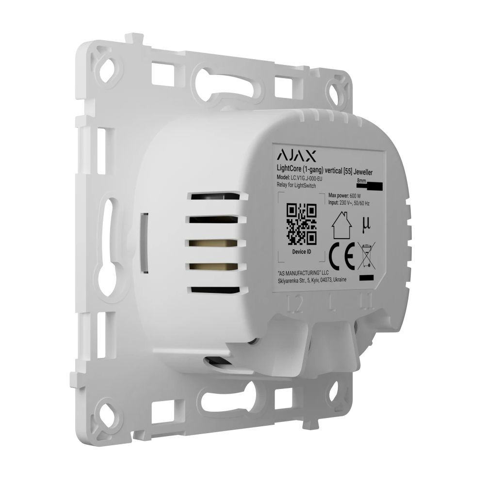 Ajax LightCore (1-gang) vertical складова частина для сенсорного вимикача світла LightSwitch. Сумісність із кнопками: CenterButton (1-gang) vertical, SideButton (1-gang) vertical. Сумісність із Hub: Hub Plus, Hub 2 (2G), Hub 2 (4G), Hub 2 Plus, Hub Hybrid (2G), Hub Hybrid (4G), ReX, ReX 2. Напруга живлення: 230 В, 50 Гц. Середнє споживання: до 200 мВт. Максимальна комутована потужність: 600 Вт. Захист за струмом: понад 2,6 А. Захист за температурою: понад +60°C