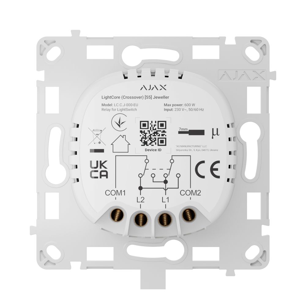 Ajax LightCore (Crossover) складова частина для сенсорного вимикача світла LightSwitch. Сумісність із кнопками: SoloButton (1-gang), CenterButton (1-gang), SideButton (1-gang). Сумісність із Hub: Hub Plus, Hub 2 (2G), Hub 2 (4G), Hub 2 Plus, Hub Hybrid (2G), Hub Hybrid (4G), ReX, ReX 2. Напруга живлення: 230 В, 50 Гц. Середнє споживання: до 200 мВт. Максимальна комутована потужність: 600 Вт. Захист за струмом: понад 2,6 А. Захист за температурою: понад +60°C