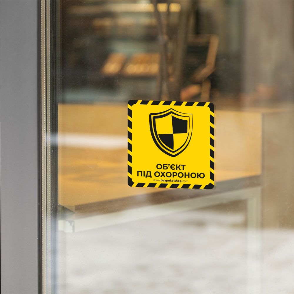 Наклейка жовта «Об'єкт під охороною» надрукована на самоклеючій плівці - оракалі. Розмір: 120 х 120 мм. Призначена для наклеювання в місцях, де реалізована охорона приміщення або території, для інформування людей про наявність, можливо, сигналізації, відеокамер та охоронного патрулювання.