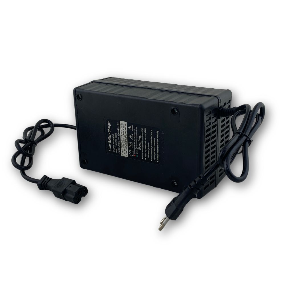 Зарядний пристрій 72V10А для заряджання літій-іонних акумуляторів. Вихідна номінальна напруга 29.4В / 42В / 54.6В / 58.8В / 67.2В / 71.4В / 73В / 84В / 87.6В / 88.2В і номінальний струм 2A / 3A / 4A / 5A / 6A / 7A / 8A / 9A. Вхідна напруга AC 220 В / 50 Гц. Індикація заряду акумулятора: червоний світлодіод: у процесі заряджання; зелений світлодіод: заряджений. Матеріал корпусу: пластик
