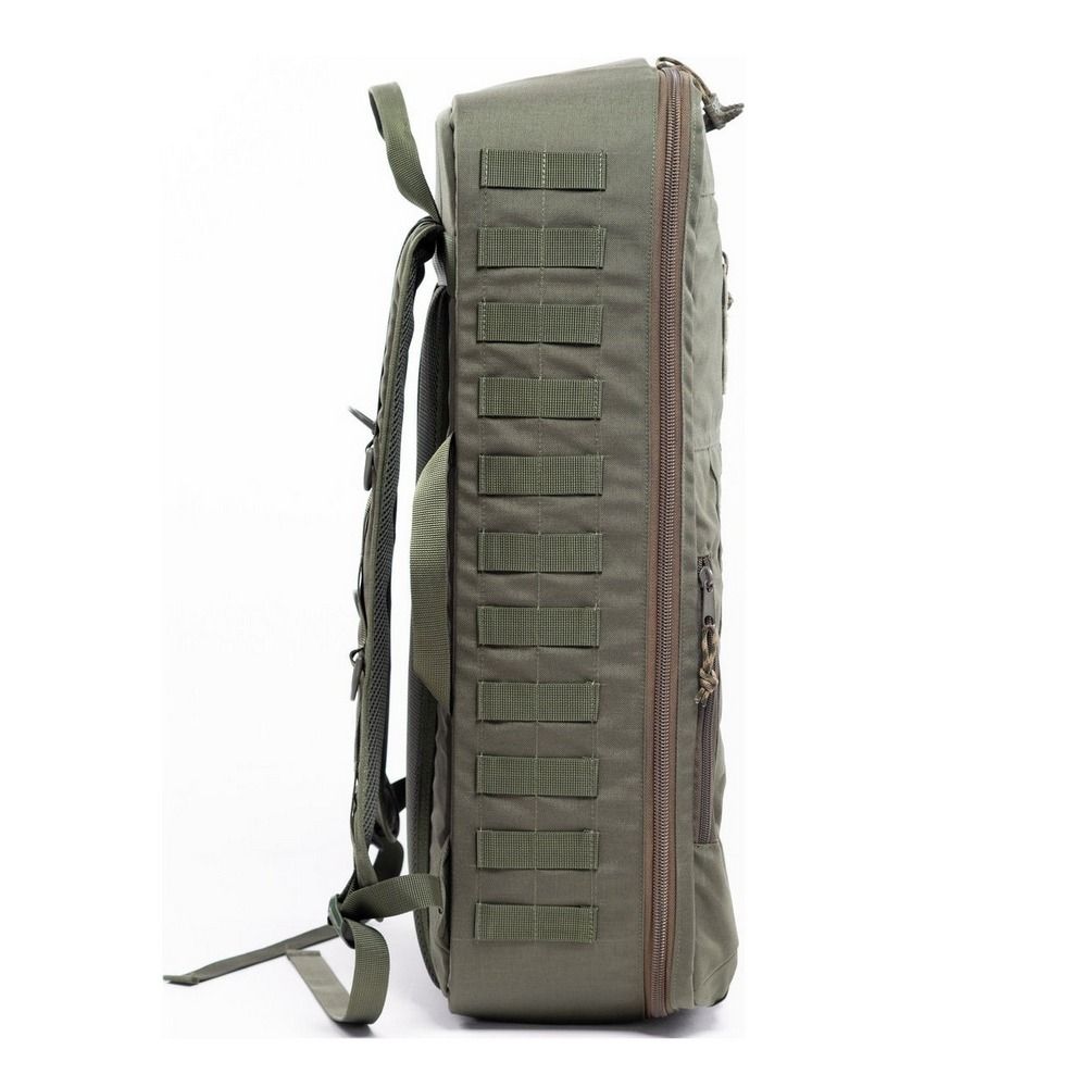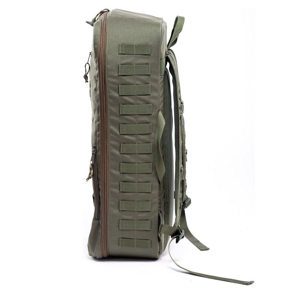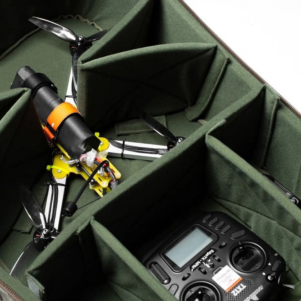 Захисний рюкзак з армуванням та амортизацією для перенесення та зберігання дронів. З дощовиком. Матеріал: кордура 1000 з IRR просоченням. Зовнішні розміри: 63×37×19 см. Внутрішні розміри: 60×34×16 см. Об'єм: 30 л. Вага: 1,8 кг. Колір: олива.