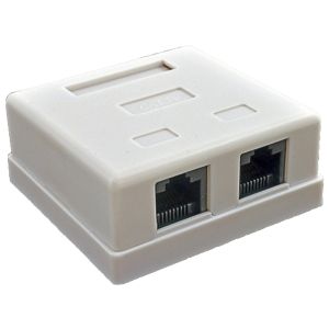 Розетка пластмасова 2хRJ45 UTP білого кольору. Призначена для монтажу на стіну або іншу рівну поверхню за допомогою саморізів або двостороннього скотчу.