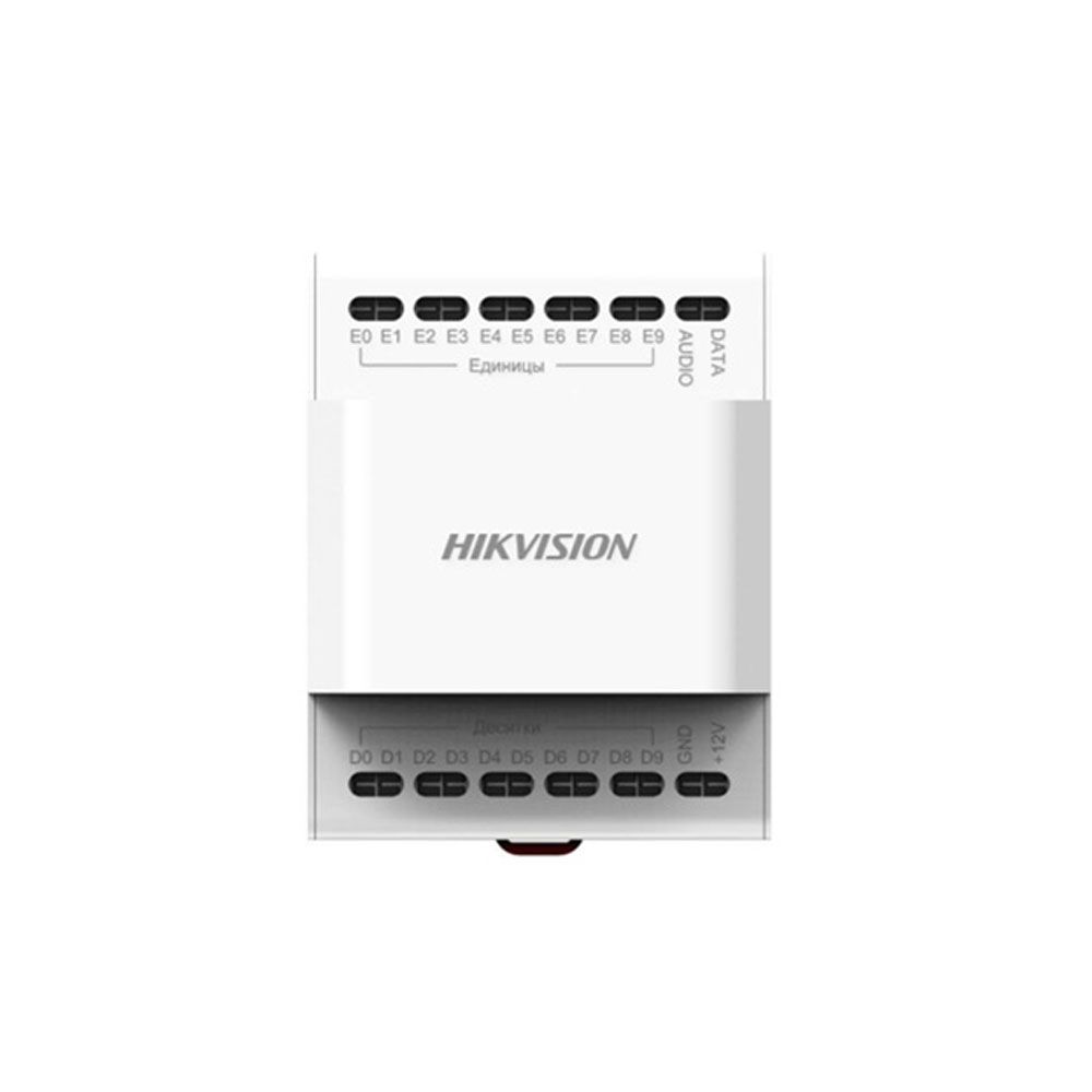 Hikvision DS-KAD20 обслуговуючий комунікатор для великої домофонної системи. Являє собою блок аудіо узгодження. Призначений для підключення двопровідної аудіотрубки до зовнішнього обладнання. Працює від постійного живлення формату 12В DC, або від панелі виклику. Відрізняється промисловим дизайном і можливістю настінного монтажу всередині приміщень або на DIN-рейку. DS-KAD20 має 20 портів для домофонів, а також 2 виходи, що з'єднують з терміналами виклику. Можливе впровадження в мережу 100 трубок.