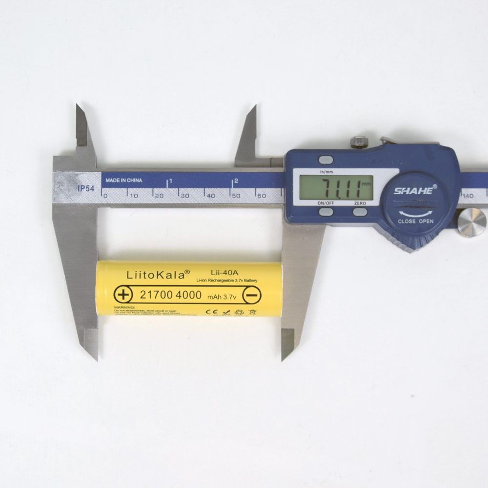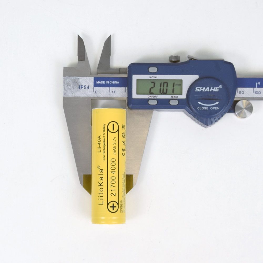 LiitoKala 21700 Lii-40A це літій-іонний акумулятор високої потужності з номінальною напругою 3.7V і ємністю 4000 мА·год. Формат 21700, високострумовий, без вбудованого захисту. Ємність: номінальна - 4000 мА·год; мінімальна - 3950 мА·год. Напруга: мінімальна - 2.5В; номінальна - 3.7В; максимальна - 4.2В. Струм заряду: стандартний - 1А; швидкий - 2A. Струм розряду: постійне навантаження - 15A; короткочасне навантаження - 40А. Внутрішній опір: ≤ 20 mΩ. Плоский плюсовий контакт (Flat Top). Розміри: ∅ 21.7 x 71 мм