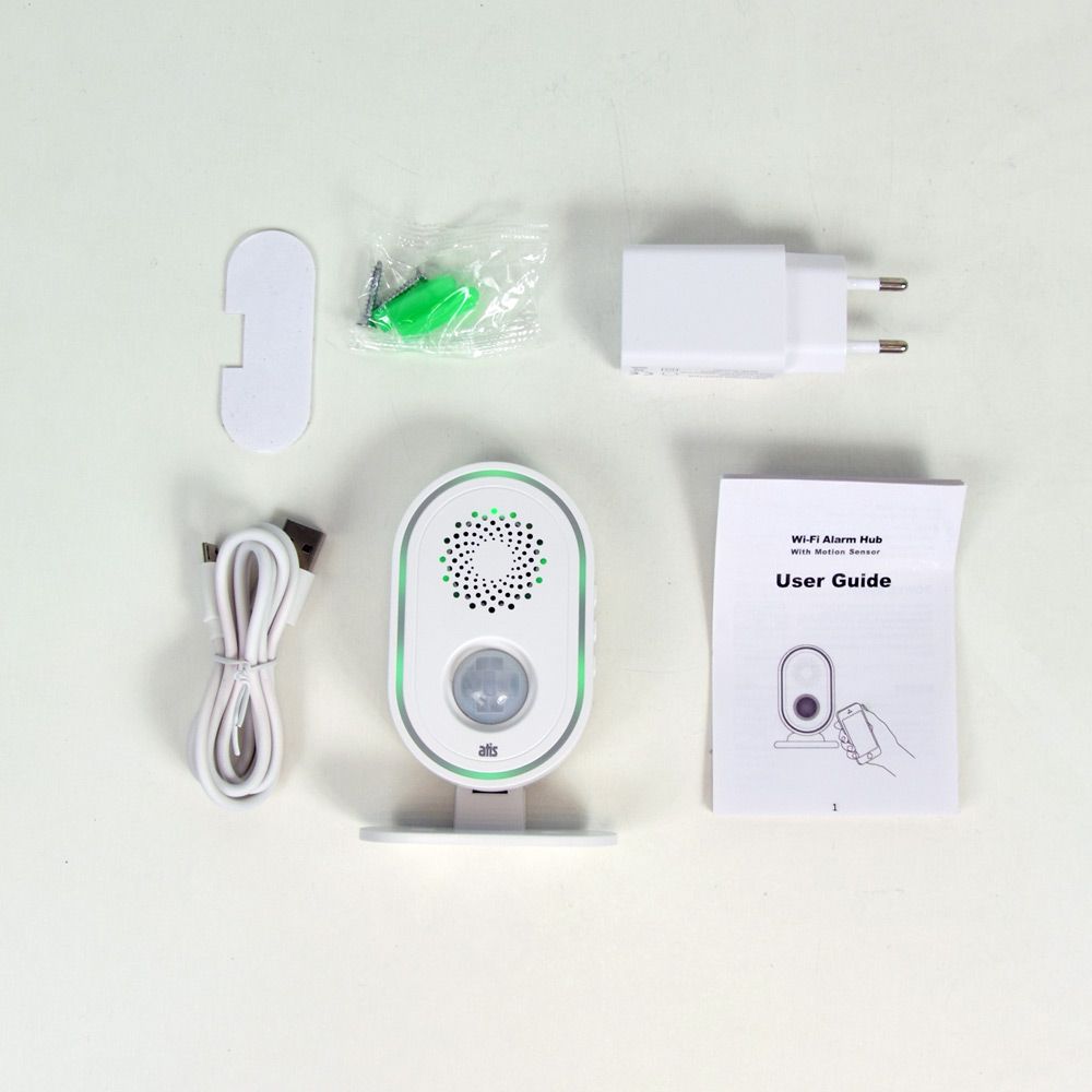 Охоронний хаб ATIS-850T багатофункціональна система безпеки, що об'єднує в собі охоронну сигналізацію, інфрачервоний датчик руху і вбудовану сирену. Підключення: Wi-Fi. Підтримка застосунків: Tuya Smart, Smart Life. Дальність датчика руху: до 5 метрів. Сирена: 30 мелодій, 4 рівні гучності, вимкнення звуку. Підтримка додаткових пристроїв: до 30 бездротових датчиків і брелоків (433 МГц). Живлення: 5 В, Micro USB. Резервне живлення: вбудований літієвий акумулятор 3.7 В / 300 мА-год (до 2 годин роботи)