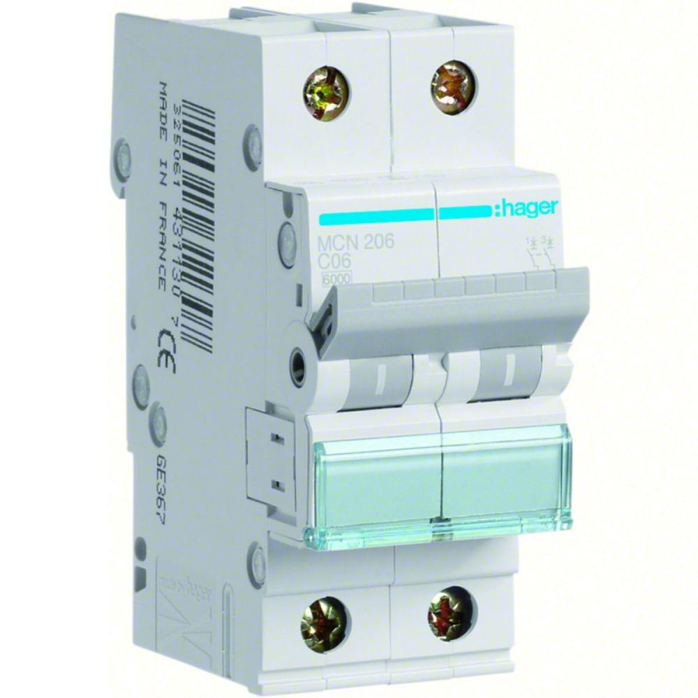 Автоматичний вимикач Hager MCN206 2P 6 кА C-6A 2M