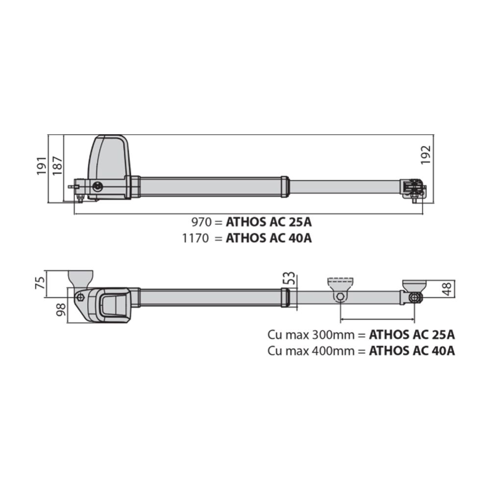 Електро-механічний привід ATHOS AC A25 BASE KIT для розпашних воріт з вагою стулки до 700 кг і довжиною стулки до 2.5 м. Вбудований 2-х канальний радіоприймач на 63 користувачі. Програмування пультів через радіоканал. Режим "Хвіртка". Ручне розблокування ключем у разі відсутності напруги в мережі. Швидке закривання після звільнення фотоелементів. Блокування імпульсу "Старт" у фазі відкривання. Блок керування: Alena SW2. Потужність: 280 Вт