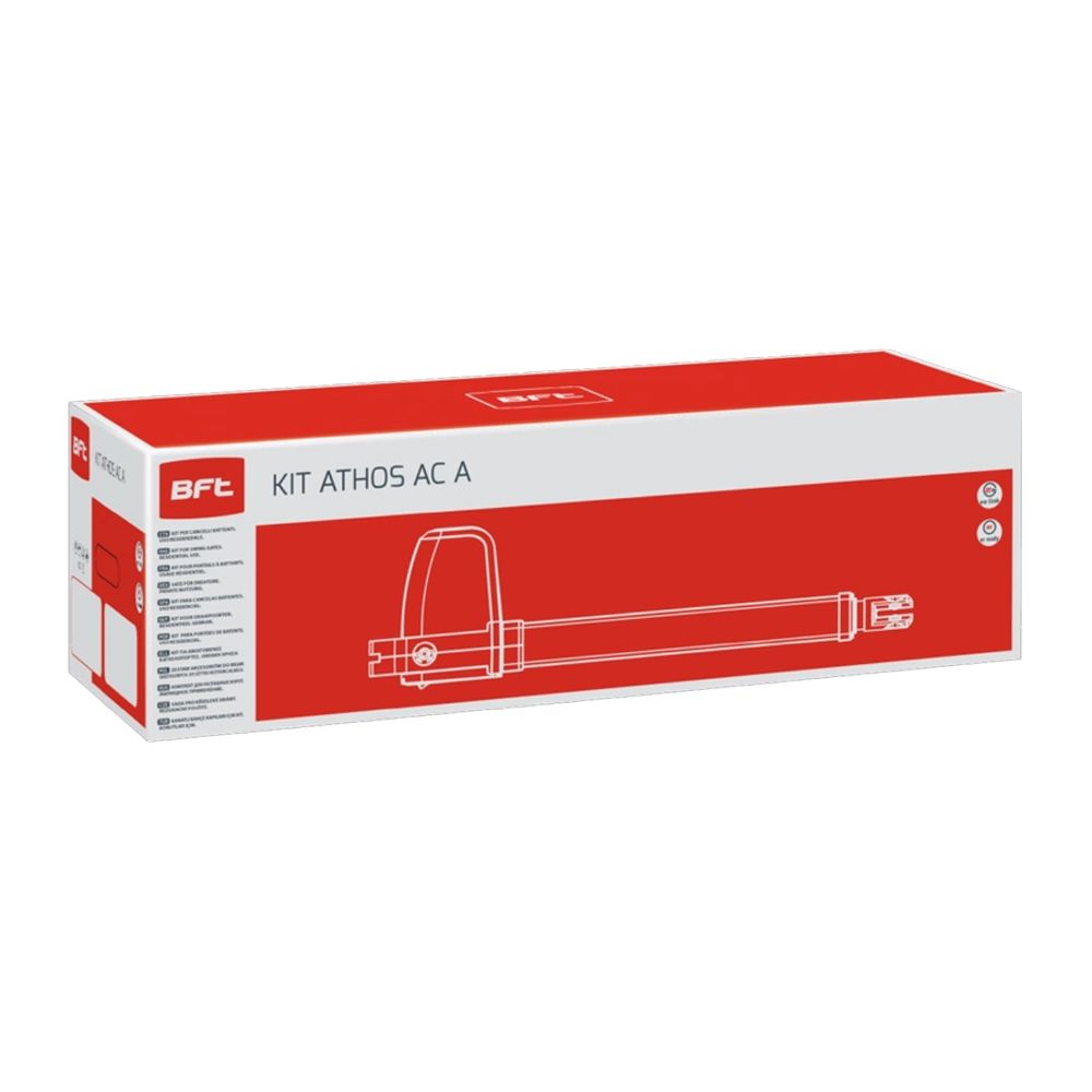Електро-механічний привід ATHOS AC A40 BASE KIT для розпашних воріт з вагою стулки до 800 кг і довжиною стулки до 4 м. Вбудований 2-х канальний радіоприймач на 63 користувачі. Програмування пультів через радіоканал. Режим "Хвіртка". Ручне розблокування ключем у разі відсутності напруги в мережі. Швидке закривання після звільнення фотоелементів. Блокування імпульсу "Старт" у фазі відкривання. Блок керування: Alena SW2. Потужність: 280 Вт