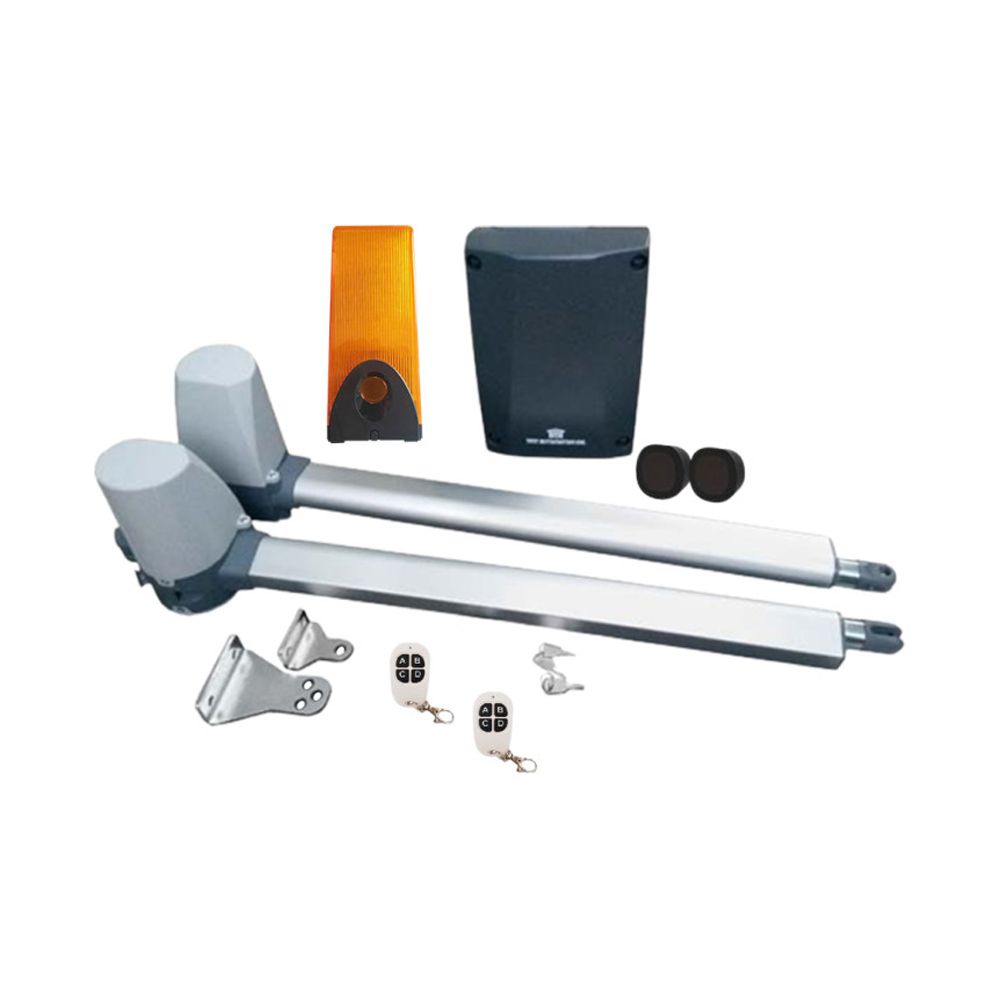Автоматика для розпашних воріт GANT SET TERRIER оснащена самоблокувальним приводом для надійного захисту воріт, плавним стартом і зупинкою для м'якого і безшумного руху, а також функцією ручного розблокування. Система підтримує режим хвіртки, дистанційне керування через Wi-Fi і зручне програмування з електронним регулюванням зусилля двигунів. Додатково в комплект входять фотоелементи, сигнальна лампа для підвищення безпеки і пульти дистанційного керування.