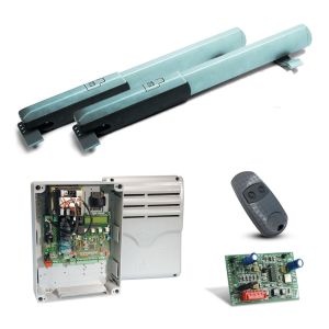 Комплект автоматики для розпашних воріт шириною до 5 м і вагою до 1000 кг. До комплекту входять: приводи, що самі блокуються, із кінцевими вимикачами – 2 шт., короб із панеллю керування – 1 шт., радіоприймач одноканальний 433 МГц – 1 шт., пульт ДК двоканальний – 1 шт. Призначений для інтенсивного використання, штовхаюче зусилля 3000Н, час відчинення на 90° регульована, потужність 130Вт, живлення 24В