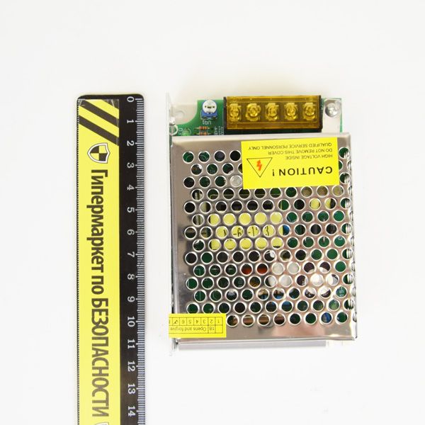 Блок живлення імпульсний, одноканальний, вихід: +12 В / 5 А, клемник; вхід: ~176-245 В, клемник; металевий перфорований корпус. Розміри 78 x 110 x 37 мм.
