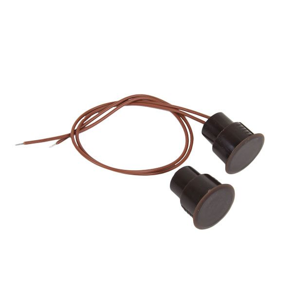 Магнітоконтактний датчик відкриття (геркон). Врізний тип встановлення. Робоча відстань до 20 мм. Пластиковий корпус коричневого кольору. Не вимагає подачі живлення. Розміри 25х24 мм.