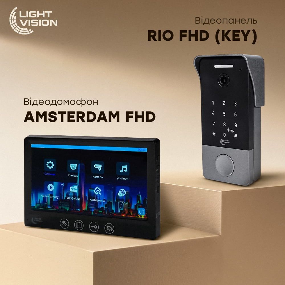 Комплект відеодомофона Light Vision: відеодомофон 7" AMSTERDAM FHD Black та відеопанель 2Mp RIO FHD(KEY) Silver
