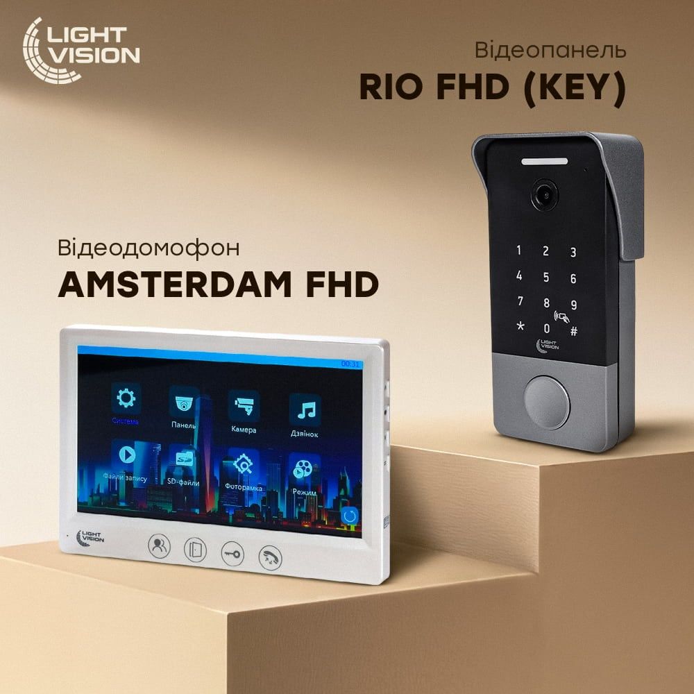 Комплект відеодомофона Light Vision: відеодомофон 7" AMSTERDAM FHD White та відеопанель 2Mp RIO FHD(KEY) Silver