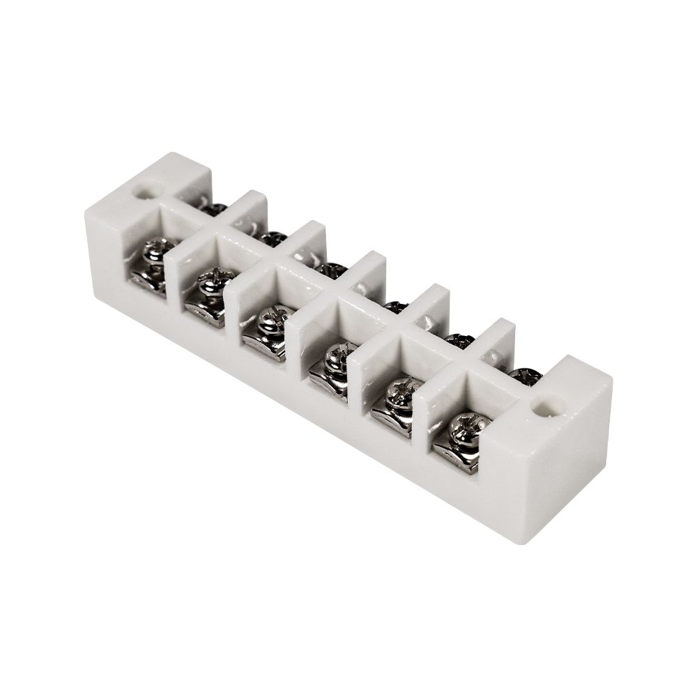Керамічна клема з 6 полюсами з відкритими контактами, з зовнішнім підключенням дротів. Номінальна напруга 250 В, струм 20 А. Розміри 98 / 24 / 20 мм, вага 102 г
