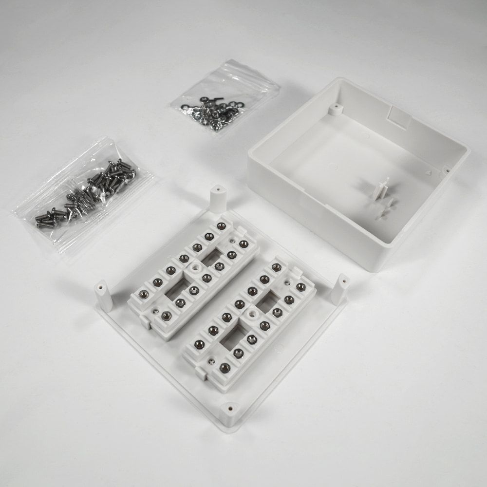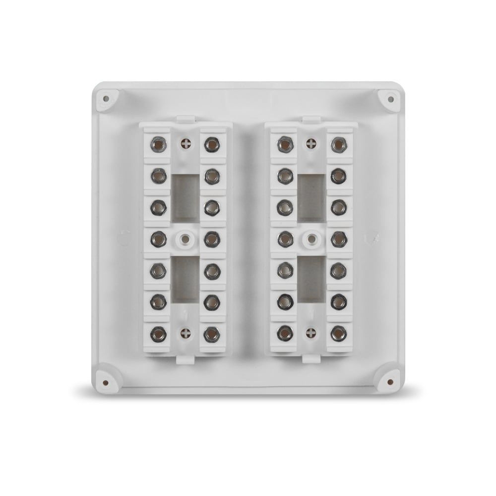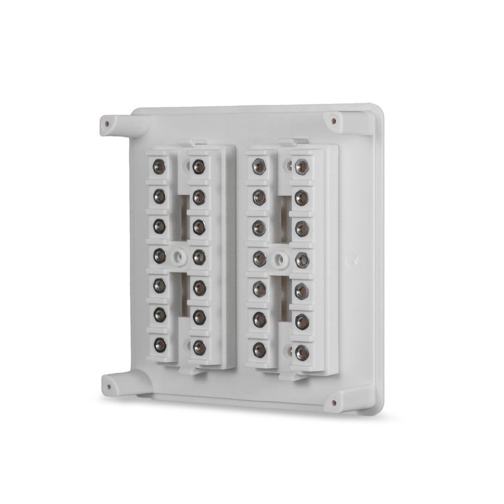 З'єднувальна коробка, 28 контактів. Призначена для монтажу на стіну або стелю. Матеріал пластик, розміри 100 / 100 / 30 мм