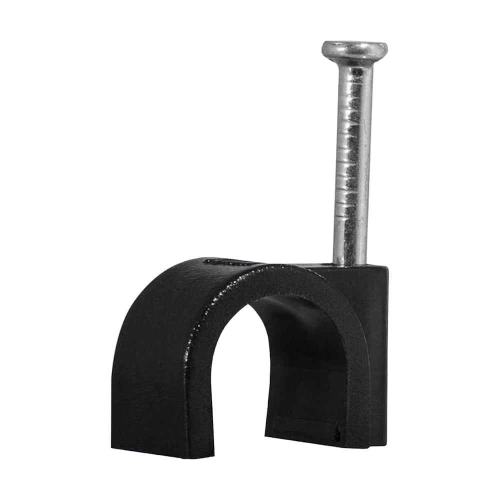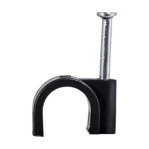 Скоба з цвяхом для кріплення кабелю діаметром до 5 мм; матеріал корпусу пластик, цвях зі сталі; монтаж без свердління – встановлення за допомгою забивання цвяха молотком; постачається комплектом 100 штук