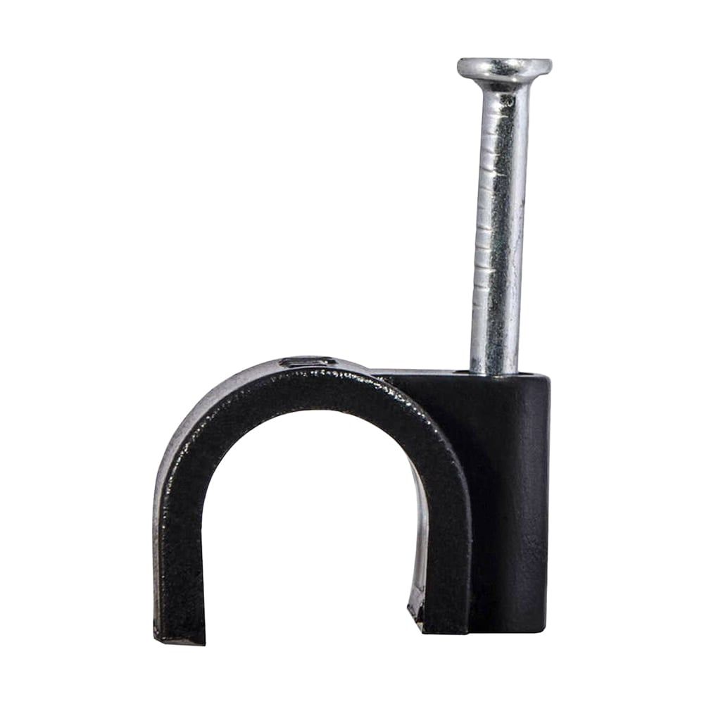 Скоба з цвяхом для кріплення кабелю діаметром до 6 мм; матеріал корпусу пластик, цвях зі сталі; монтаж без свердління – встановлення за допомгою забивання цвяха молотком; постачається комплектом 100 штук
