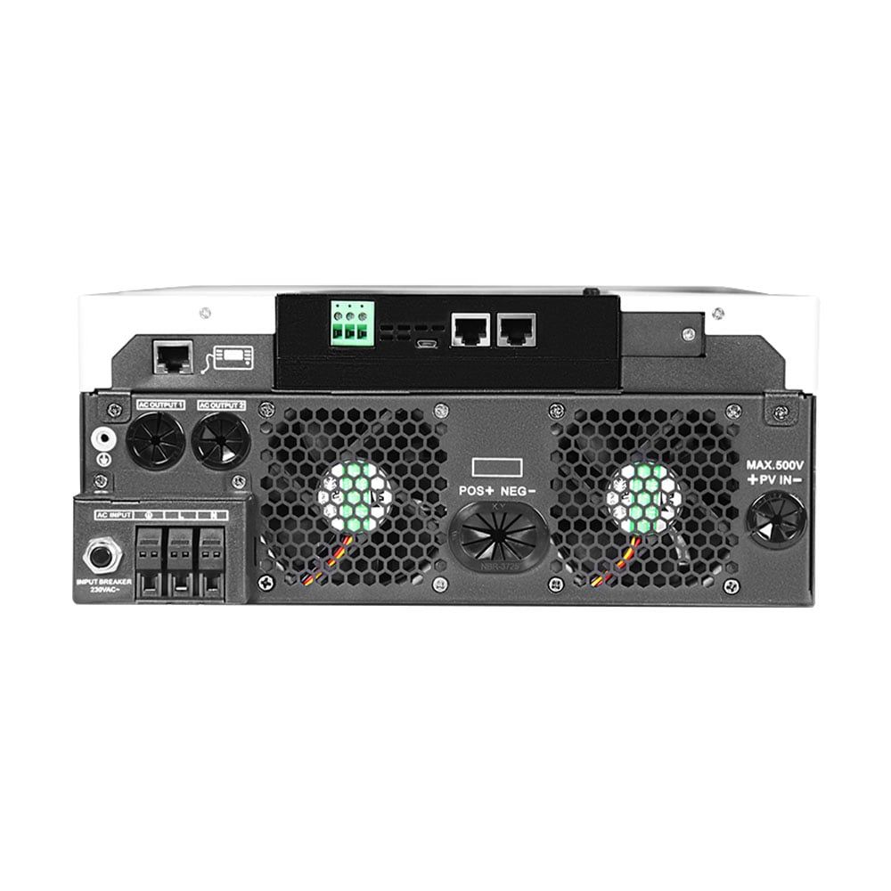 Автономний однофазний інвертор для сонячних панелей; максимальна потужність 6.2 кВт, максимальна короткочасна потужність 12.4 кВА; правильна синусоїда на виході 220 В; вбудований MPPT-контролер та мережевий зарядний пристрій; максимальний струм заряду 120 А; вхідна напруга 90-280 В; діапазон напруги від сонячних панелей 60-450 В, макс. потужність 6000 Вт; ККД 93%; вихідна напруга 230 В ±5%; вихідна частота 50/60 Гц; напруга акумуляторної системи 48 В; час перемикання на АКБ 15 мс; підтримка заряду АКБ типу AGM/GEL/LiFePo4/Li-ion; вбудований локальний WiFi – лише для моніторингу з мобільного застосунку; знімний LCD-дисплей; функція «холодного» пуску; режим підмішування; захист від перевантаження, короткого замикання, перегріву; робоча температура 0°C~+50°C; розміри 481 / 300 / 130 мм, вага 13 кг