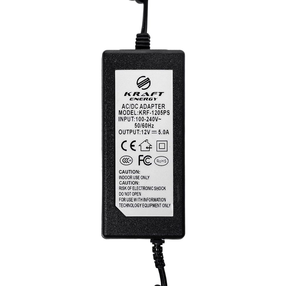 Імпульсний блок живлення; номінальна вихідна напруга 12 В, вихідний струм 5 А; вхідна напруга 155-265 В, 50-60 Гц; пластиковий корпус; довжина шнура 12 В – 90 см, 220 В – 40 см; загальна довжина пристрою 145 см; розміри 125 / 55 / 33 мм