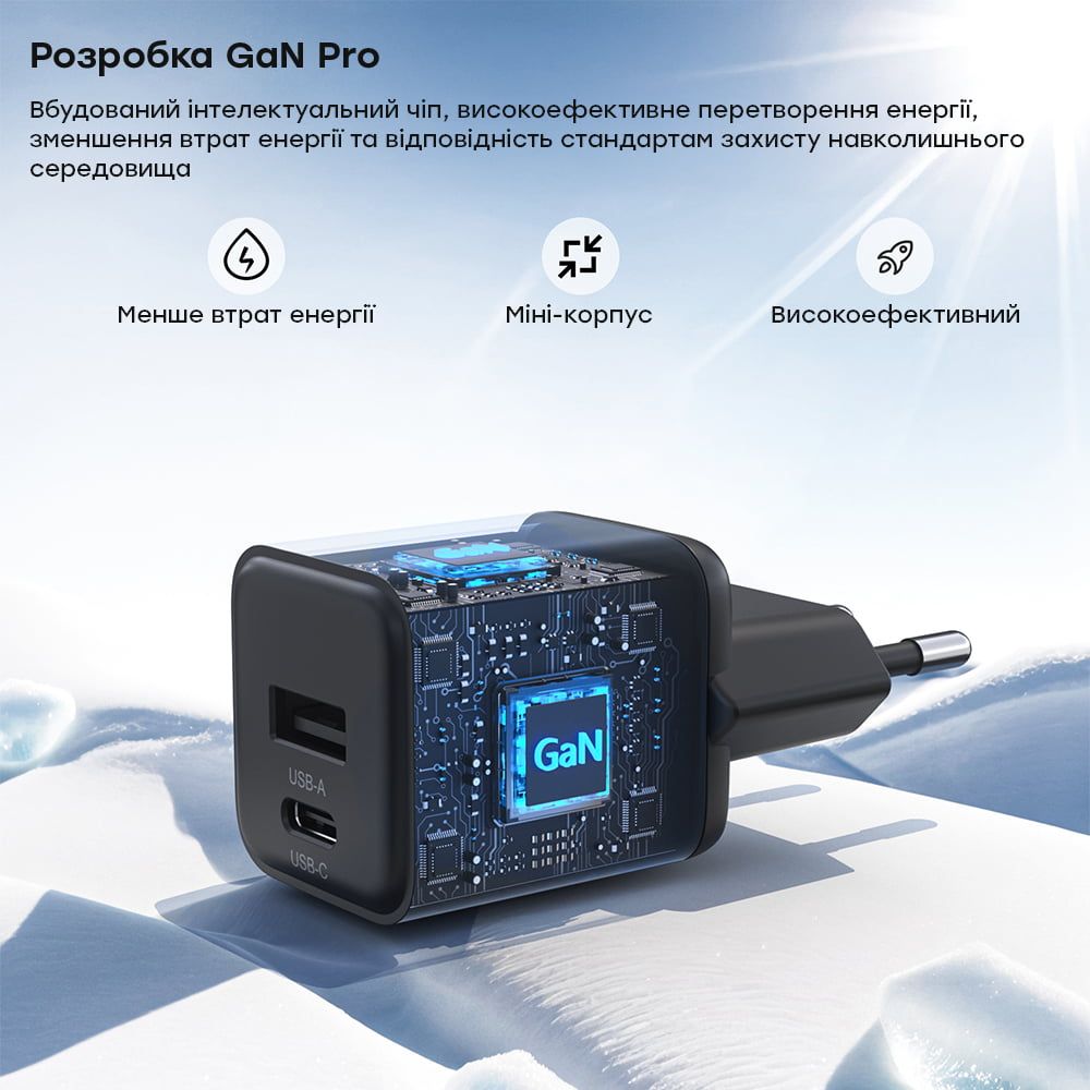 Мережевий зарядний пристрій (PD 30 Вт) з 2 USB-портами: USB-C та USB-A; вхідна напруга 100-240 В 50/60 Гц, 0.8 А макс; максимальна вихідна потужність 30 Вт; вихід 1 USB Type-C: 5В/3А, 9В/3А, 12В/2.5А, 15В/2А, 20В/1.5А (30 Вт макс.); вихід 2 USB Type-A: 5В/3А, 9В/2А, 12В/2.5А (18 Вт макс.); спільний вихід (USB Type-A + USB Type-C): 5В/3А; розміри 30.8 / 32.2 / 75 (з вилкою)
