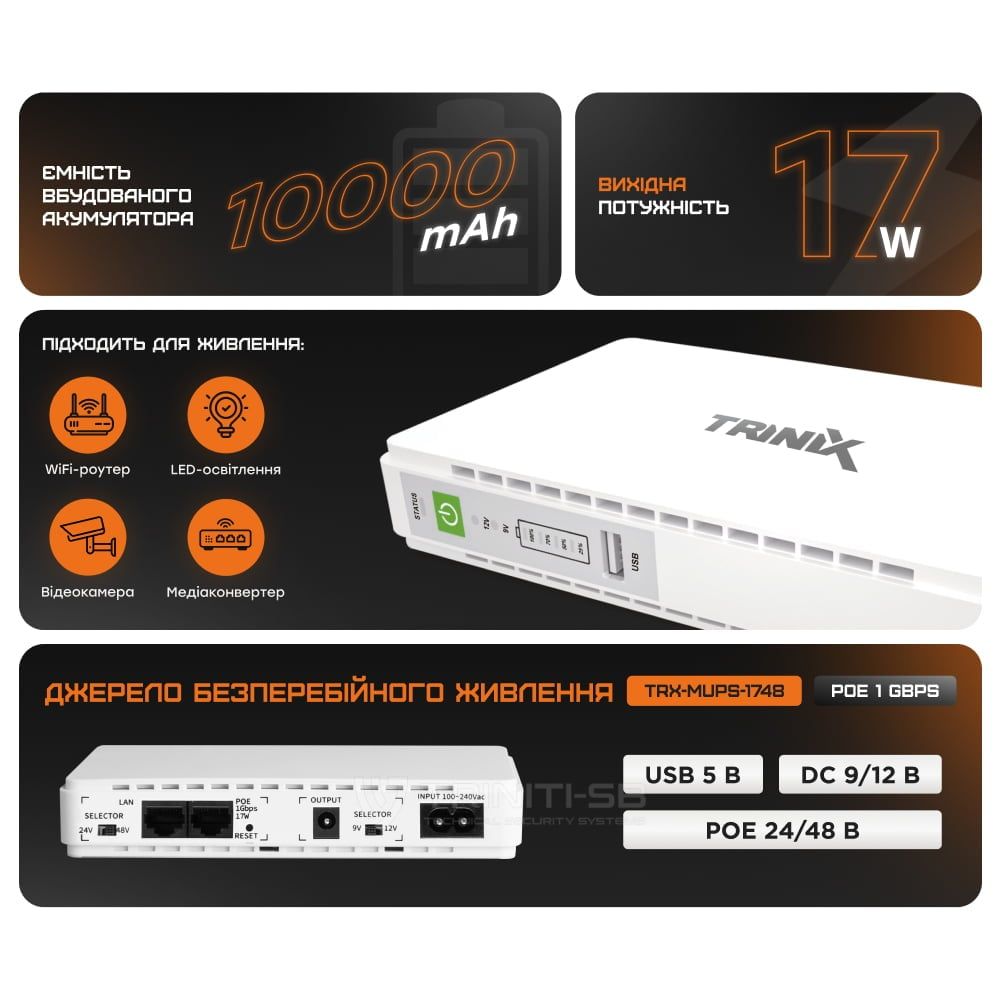 Джерело безперебійного живлення DC UPS Trinix TRX-MUPS-1748 PoE (10000mAh) 5V/9V/12V/24V/48V/PoE 1Gbps, Li-ion 4*2.5Ah, для роутера і медіаконвертера
