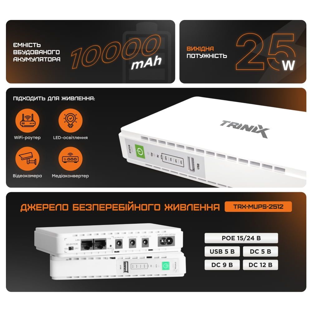 Джерело безперебійного живлення DC UPS Trinix TRX-MUPS-2512 (10000mAh) 5V/9V/12V/15V/24V/PoE, Li-ion 4*2.5Ah, для роутера і медіаконвертера