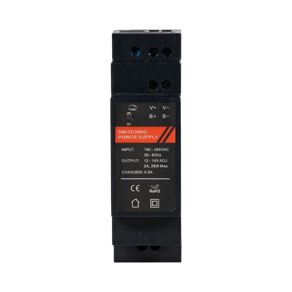 Блок безперебійного живлення імпульсний з LED-індикацією; кріплення на DIN-рейку; номінальна вихідна напруга 12 В; номінальний вихідний струм 2 A; номінальна вихідна потужність 28 Вт; вхідна напруга 190-265 В, 50-60 Гц; струм заряду акумуляторної батареї 0.5 А; пластиковий корпус; розміри 27 / 92 / 56 мм