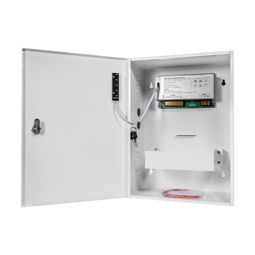 Блок безперебійного живлення імпульсний з LED-індикацією; номінальна вихідна напруга 24 В; вихідний струм номінальний 5 A, максимальний 6 А; вхідна напруга 190-265 В, 50-60 Гц; місце під 2 акумуляторні батареї 12В/18 Аг; струм заряду акумуляторної батареї 1 А; металевий бокс; 395 / 285 / 165 мм; замок+2 ключа