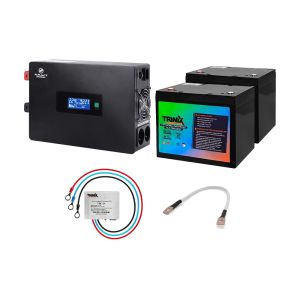 Комплект резервного живлення: високочастотний інвертор 1500VA/1.5kW Kraft + акумуляторна батарея Trinix TGL12V45Ah/20Hr GEL 2 шт. + акумуляторний балансир Trinix TBL-24 + кабель для з'єднання АКБ. Високочастотний однофазний інвертор; номінальна потужність 1500 ВА/1500 Вт, максимальна короткочасна потужність 3000 ВА; правильна синусоїда на виході 220 В; вбудований мережевий зарядний пристрій; струм заряду до 20 А; діапазон вхідної напруги 170-270 В; ККД 93%; вихідна напруга 220 В ±5%; вихідна частота 50 Гц; напруга акумуляторної системи 24 В; час перемикання на АКБ 10 мс; підтримка заряду АКБ типу AGM/GEL/LiFePO4; 2 розетки; функція «холодного» пуску; захист від перезаряду АКБ, перевантаження, короткого замикання; робоча температура 0°C~+40°C; розміри 317 / 230 / 105 мм; вага 3.85 кг. Акумуляторна літій-залізо-фосфатна батарея (LiFePO4); ємність 70 Аг, вихідна напруга 12 В; кількість циклів: > 8000; макс. струм заряду 25 А / розряду 50 А; розміри 260 / 165 / 210 мм; вага 8.24 кг. Акумуляторний балансир для вирівнювання заряду двох послідовно з'єднаних 12 В акумуляторних батарей або декількох паралельних ланцюгів послідовно з'єднаних акумуляторів. Струм балансування з найвищою напругою до 5 А. Точність регулювання 10 мВ; світлодіодна індикація режиму роботи; можливе використання з BMS; розміри 64 / 50 / 10 мм; вага 116 г. Кабель / перемичка для з’єднання акумуляторних батарей; довжина 30 см; дріт мідний ПВ-3 перерізом 10 мм2; клеми М8