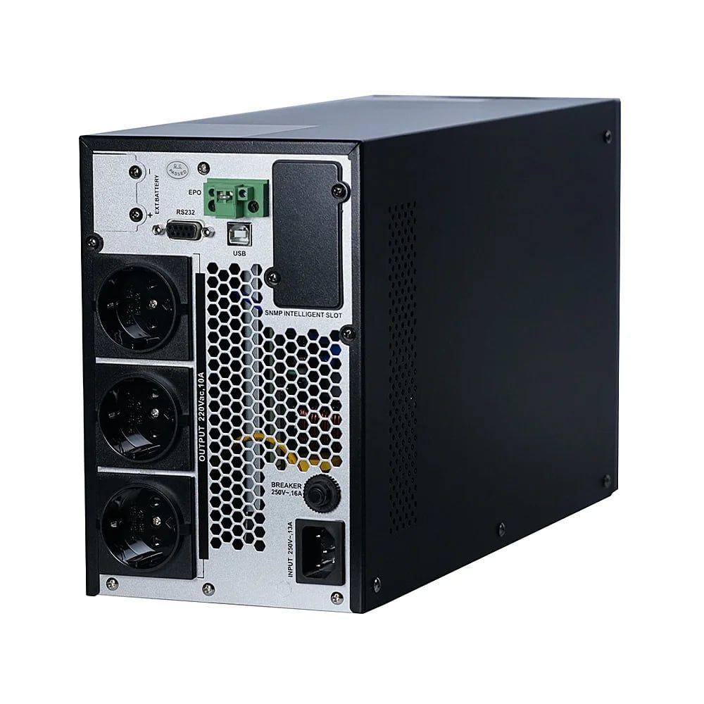 Онлайн ДБЖ (подвійного перетворення) з LCD-дисплеєм; потужність 2000 ВА/2000 Вт; вхідна напруга 110-300 В; вихід 208/220/230/240 В, правильна синусоїда; акумуляторна батарея зовнішня, напруга 72 В; регульований струм заряду 1-12 А; SNMP-слот; розміри 410 / 145 / 230 мм; вага 6.74 кг. Підходить для котлів
