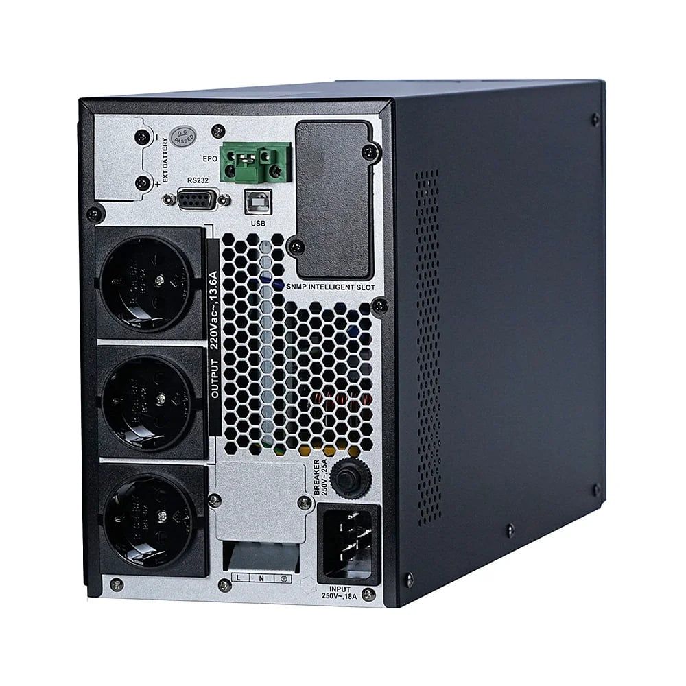 Онлайн ДБЖ (подвійного перетворення) з LCD-дисплеєм; потужність 3000 ВА/2400 Вт; вхідна напруга 110-300 В; вихідна напруга 208/220/230/240 В, правильна синусоїда; акумуляторна батарея вбудована, напруга 48 В (4 шт * 12 В / 9 Аг); струм заряду макс. 4 А; SNMP-слот; розміри 410 / 145 / 230 мм; вага 16.14 кг. Підходить для котлів