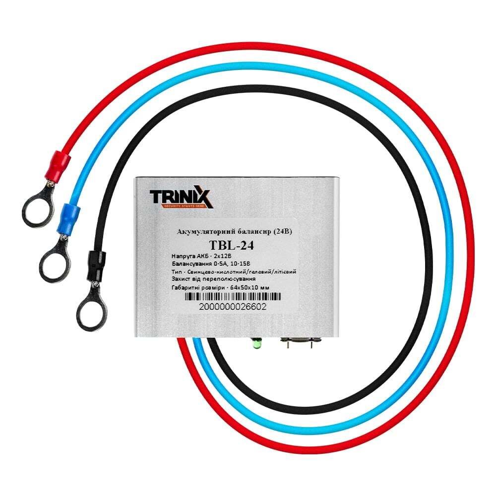 Комплект резервного живлення: високочастотний інвертор 1.5кВт Kraft KRF-SAVR1500VA/1.5kW-24V + 2 акумуляторні батареї 12В 100А·год Trinix GEL, акумуляторний балансир, перемичка M8 довжиною 30 см. Високочастотний однофазний інвертор; номінальна потужність 1500 ВА/1500 Вт, максимальна короткочасна потужність 3000 ВА; правильна синусоїда на виході 220 В; вбудований мережевий зарядний пристрій; струм заряду до 20 А; діапазон вхідної напруги 170-270 В; ККД 93%; вихідна напруга 220 В ±5%; вихідна частота 50 Гц; напруга акумуляторної системи 24 В; час перемикання на АКБ 10 мс; підтримка заряду АКБ типу AGM/GEL/LiFePO4; 2 розетки; функція «холодного» пуску; захист від перезаряду АКБ, перевантаження, короткого замикання; металевий корпус; робоча температура 0°C~+40°C; розміри 317 / 230 / 105 мм; вага 3.85 кг. Акумуляторна батарея гелева (GEL); ємність 100 А·год, вихідна напруга 12 В; тип клем Т14; розміри 230 / 330 / 180 мм; вага 28±3% кг. Акумуляторний балансир для вирівнювання заряду двох послідовно з'єднаних 12 В акумуляторних батарей або декількох паралельних ланцюгів послідовно з'єднаних акумуляторів; струм балансування з найвищою напругою до 5 А; точність регулювання 10 мВ; світлодіодна індикація режиму роботи; можливе використання з BMS; розміри 64 / 50 / 10 мм; вага 116 г