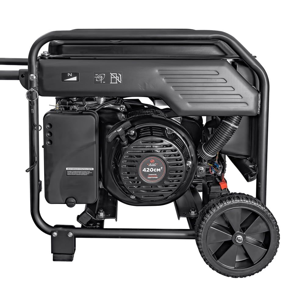 Генератор інверторний бензиновий; номінальна потужність 7 кВт; максимальна потужність 7.5 кВт; однофазний; вихідна напруга 220 В; 3 розетки 230 В; регулятор напруги; тип запуску: електричний стартер / ручний. Двигун: одноциліндровий чотиритактний OHV з об’ємом 420 см.куб., з примусовим повітряним охолодженням; максимальні витрати палива 1.6 л/год, об’єм паливного баку 17 л, об’єм мастила у картері 1.1 л. VFT-метр, USB-вихід, захист від перевантаження і низького рівня мастила, можливість паралельного підключення. Розміри 605 / 514 / 537 мм. Ручки та колеса для транспортування