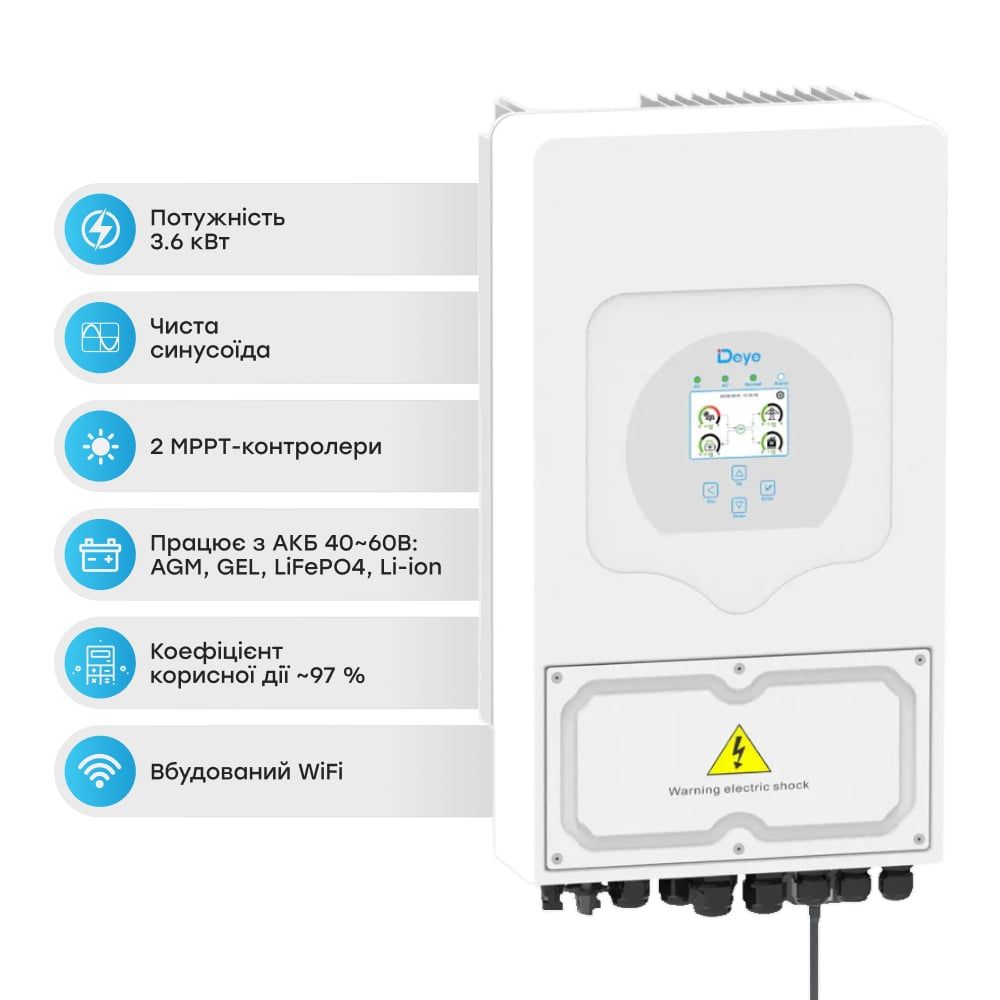 Гібридний однофазний інвертор з номінальною потужністю 3.6 кВт з 2 вбудованими MPPT-контролерами та вбудованим зарядним пристроєм; максимальна короткочасна потужність 3.69 кВт; напруга акумуляторної батареї 40-60 В; максимальний струм заряду/розряду 90 А/90 А; вхідна напруга 230 В; ККД >97%; діапазон напруги від сонячних панелей 150-425 В, максимальна потужність сонячних панелей 4680 Вт; вихідна напруга 230 В; вихідна частота 50/60 Гц; підтримка заряду АКБ типу AGM/GEL/LiFePO4/Li-ion; комунікаційні інтерфейси WiFi, CAN, RS485; настінний монтаж; клас захисту IP65; температура середовища -25°C~+60°C; розміри 580 / 330 / 232 мм, вага 20.5 кг