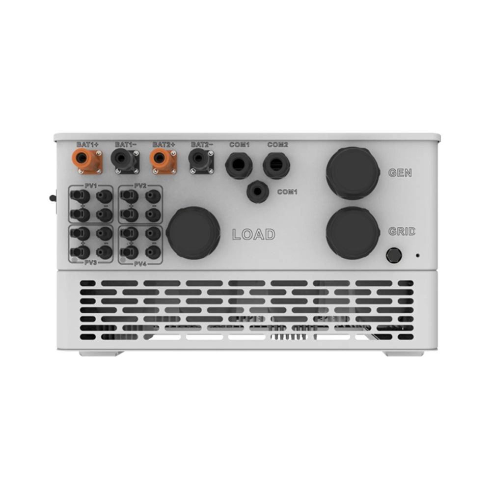 Гібридний трифазний високовольтний інвертор з номінальною потужністю 50 кВт, з 4 вбудованими MPPT-контролерами та вбудованим зарядним пристроєм; максимальна короткочасна потужність 75 кВт; напруга акумуляторної батареї 160-800 В; максимальний струм заряду/розряду 100 А/100 А; вихідна напруга 230/400 В, вихідна частота 50/60 Гц; вхідна напруга 170-280 В; ККД >97%; діапазон напруги від сонячних панелей 150-850 В, максимальна потужність сонячних панелей 65 кВт; 2 порти для підключення АКБ; підтримка заряду АКБ типу Li-ion; час перемикання на АКБ 8 мс; комунікаційні інтерфейси CAN, RS485, RS232, WiFi; дистанційне налаштування та завантаження ПЗ; настінний монтаж; клас захисту IP65; температура середовища -40°C~+60°C; розміри 894 / 572 / 294 мм, вага 80 кг