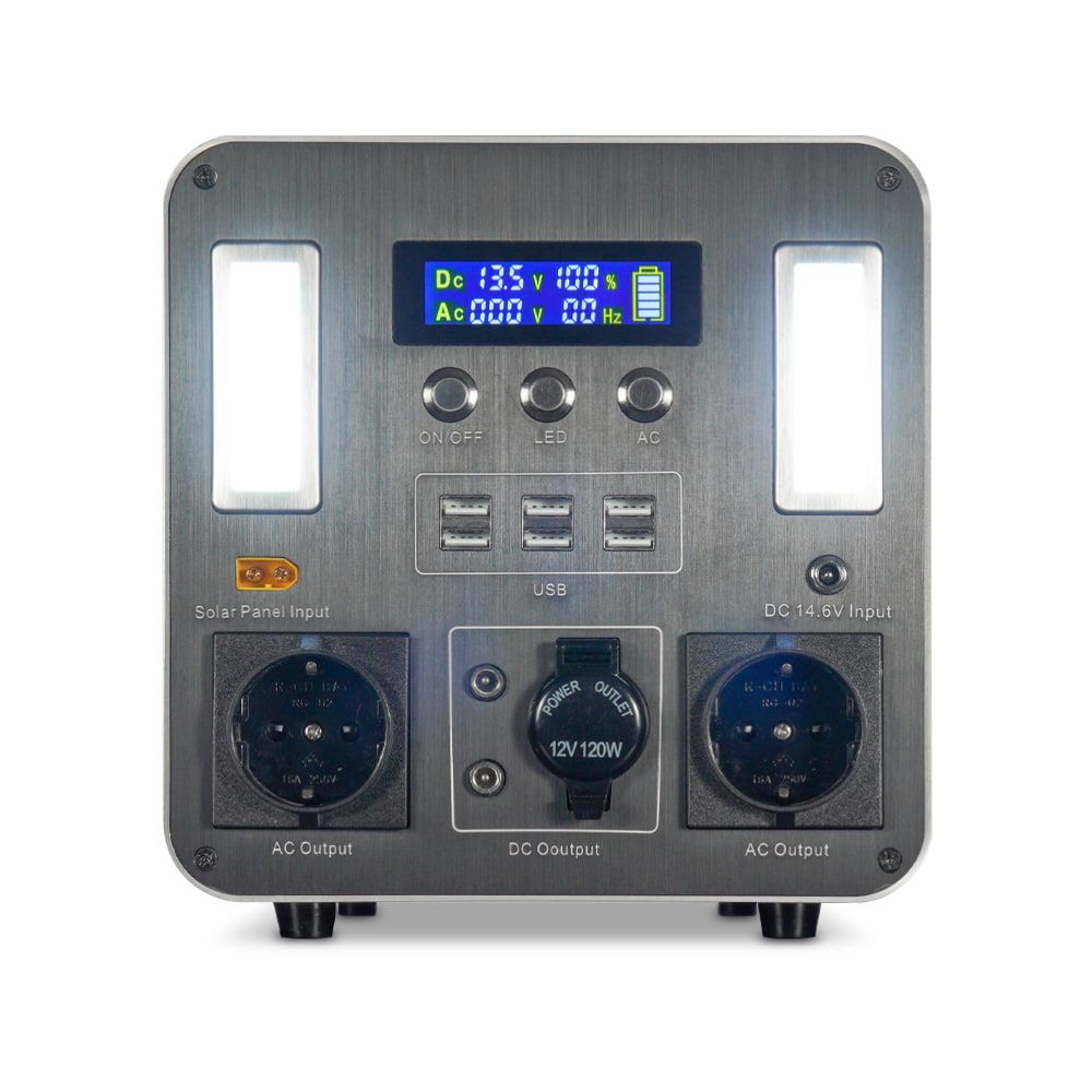 Портативне джерело живлення потужністю 1000 Вт/230 В (чиста синусоїда), пікова потужність 1030 Вт. Вбудована LiFePO4 акумуляторна батарея потужністю 960 Втг (14.4В/65Аг); вхід постійної напруги XT60 з максимальною потужністю 100 Вт з можливістю роботи від сонячних панелей, вбудований MPPT-контролер заряду (макс 18В/100Вт); вхід постійної напруги DC5521 14.6В/6А; вихід USB (тип А): 6 портів з максимальною потужністю 18 Вт кожен, з підтримкою швидкої зарядки QC3.0: 5В/3А, 9В/2А, 12В/1.5А; вихід DC: 4 шт. 12В/5А кожен; режим «автовимкнення» через 30 сек; захист від перевантаження, перегріву, перерозряду, перенапруги; кількість циклів розряду-заряду АКБ ≥2000; час до повної зарядки АКБ 5.5-8 годин; 2 шт. вбудованих LED-прожектори 4 Вт; температура заряджання 0 °C ~ + 40 °C, робоча температура -10 °C ~ +40 °C; температура зарядки 0 °C ~ + 40 °C, робоча температура -10 °C ~ +40 °C; розміри 325 / 198 / 205 мм (з ручкою 215 мм), пакування 440 / 290 / 320 мм; вага нетто 11.24 кг, брутто 12.62 кг