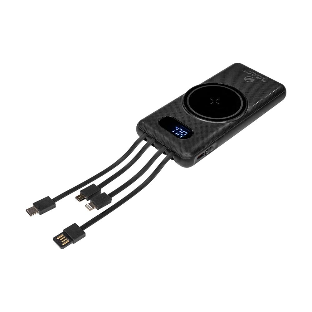 Повербанк з ємністю батареї 10000 мАг, з бездротовою зарядкою; тип батареї: літій-полімерна (Li-pol); інтерфейси: вхід/вихід Type-C PD 22.5 Вт 5V/3A, 9V/2A, 12V/1.8A; вихід USB1 5V/3A, 12V/1.8A; вихід на вбудовані кабелі 5V/3A; вбудовані 4 USB-кабелі Type-A / Type-C / microUSB / Lightning; дисплей індикації заряду; 147 / 68 / 21 мм; 250 г