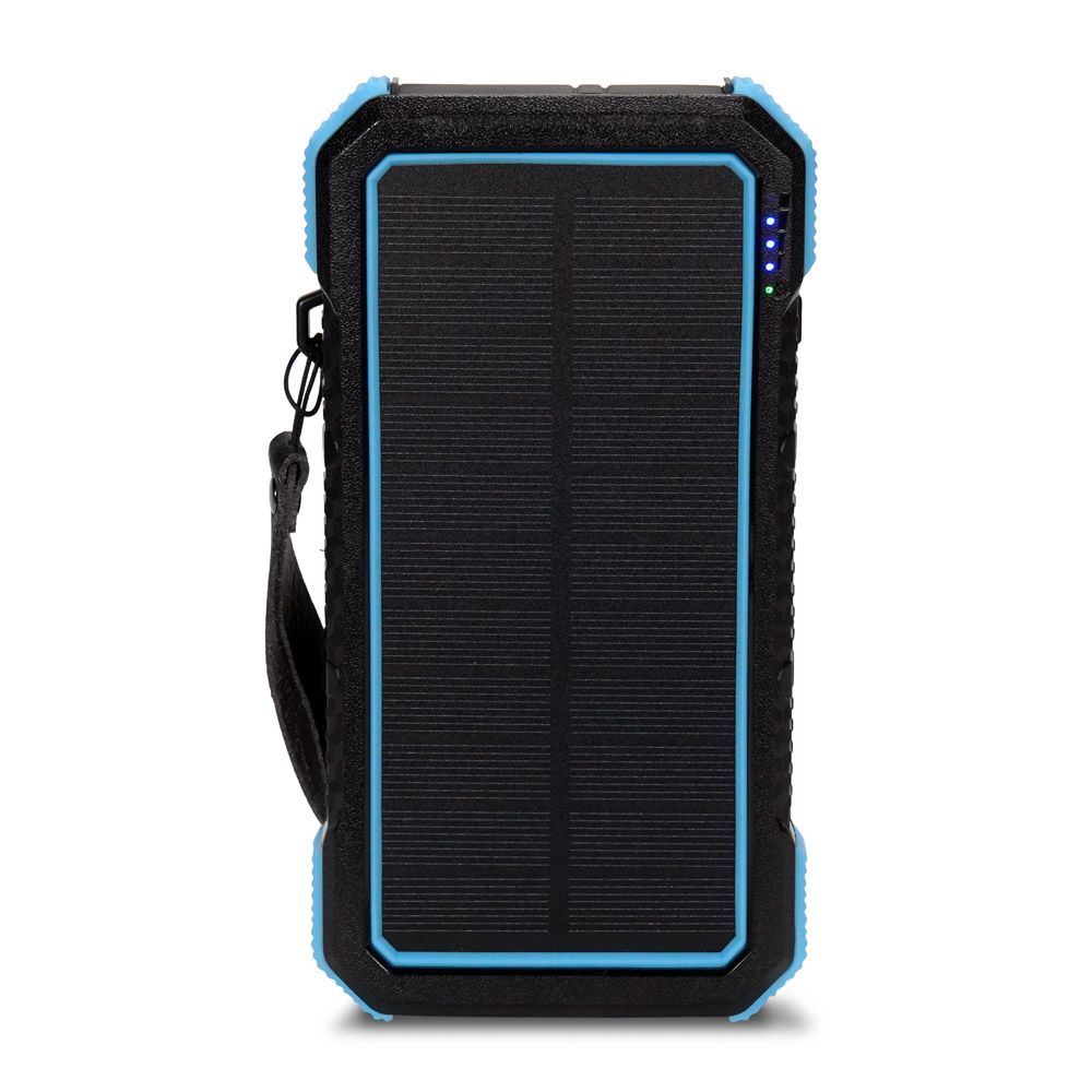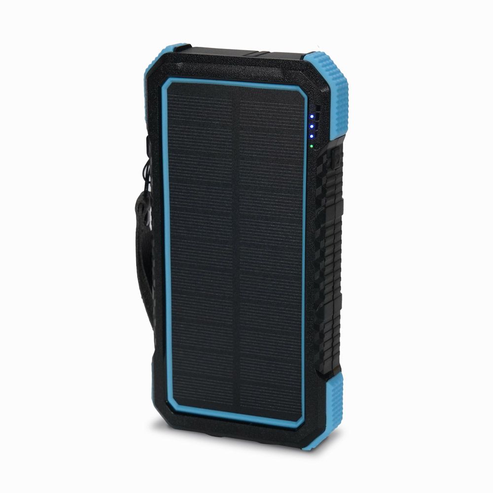 Повербанк з сонячною панеллю, з ємністю батареї 20000 мАг; технологія: літій-полімерна (Li-pol); вхідний інтерфейс: micro-USB, Type-C (двонаправлений – підходить як для заряджання підключених пристроїв, так і повербанку); вхідний струм: 5 В/2.1 А; сонячна панель 10 В 220-230 мА; вихідний інтерфейс: USB 5 В, QC2.0 18 Вт 9 В, 12 В/2 А (2 шт.); швидке заряджання батареї QC2.0 18 Вт; бездротова зарядка; індикатор заряду; ліхтарик; 170 / 90 / 26 мм; 435 г