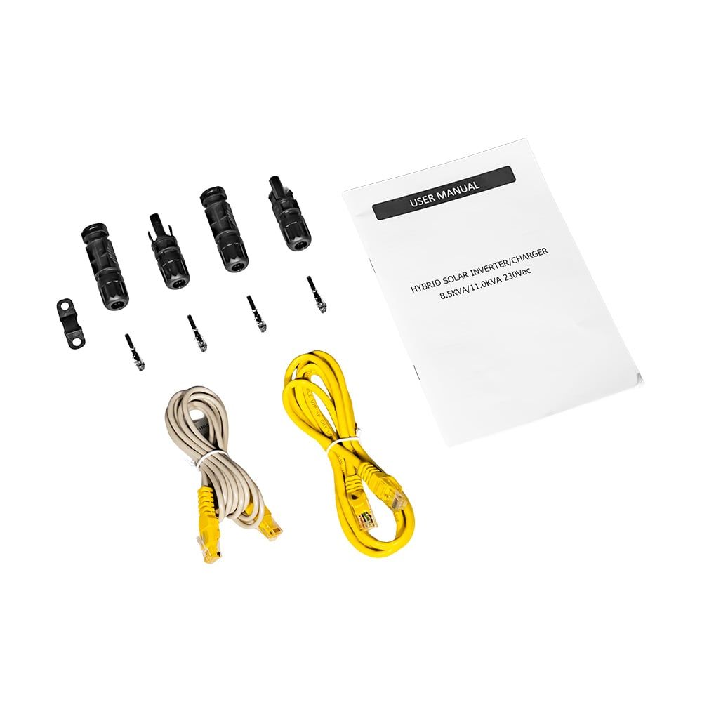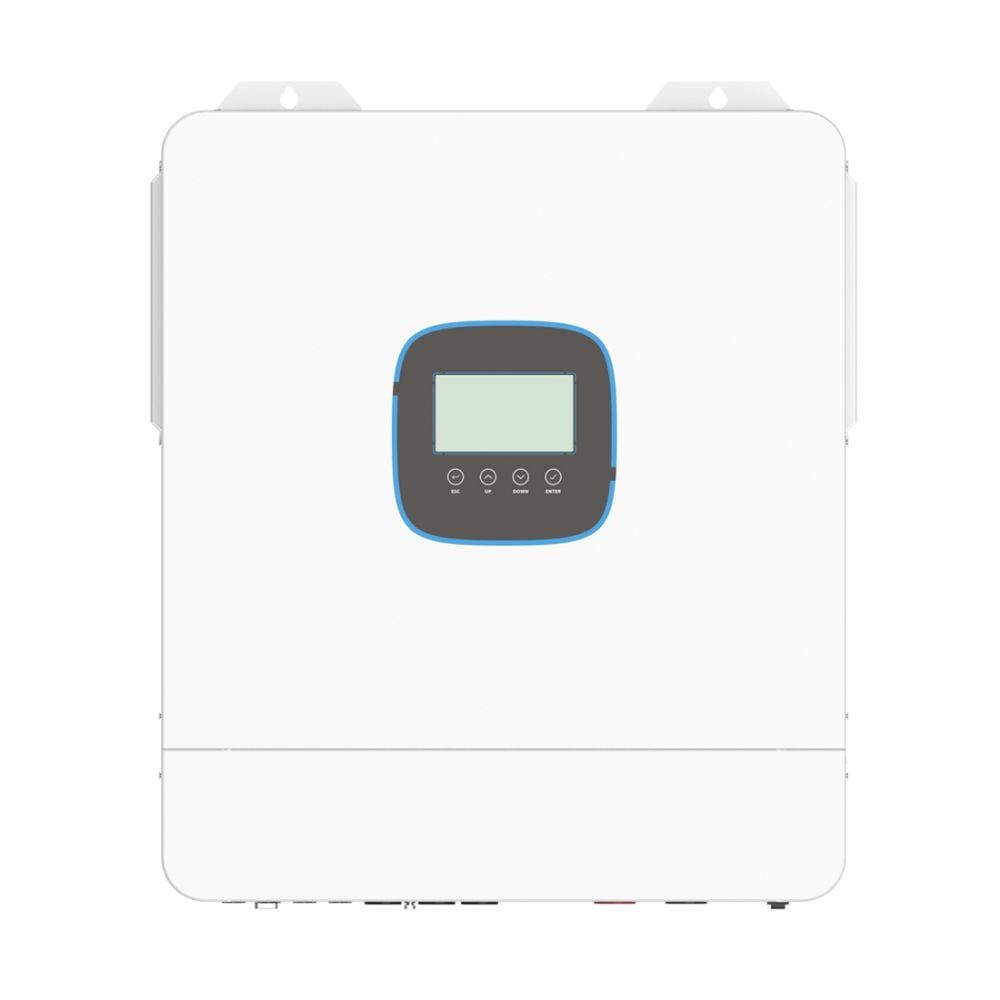 Гібридний однофазний інвертор з 2 MPPT-контролерами; максимальна потужність 11 кВт, максимальна короткочасна потужність 15.4 кВт (протягом 5 сек); правильна синусоїда на виході 220 В; 2 вбудовані MPPT-контролер та мережевий зарядний пристрій; максимальний струм заряду АКБ 120 А, сонячних панелей 160 А; вхідна напруга 90-280 В; діапазон напруги від сонячних панелей 60-500 В, макс. потужність 11000 Вт (5500 Вт *2); ККД 93%; вихідна напруга 208/220/230/240 В ±5%, вихідна частота 50/60 Гц; напруга акумуляторної системи 48 В; час перемикання на АКБ 10 мс; підтримка заряду АКБ типу AGM/GEL/LiFePo4/Li-ion, акумулятор купується окремо, можливість паралельного підключення батарей напряму до інвертора; комунікаційні інтерфейси RS485, USB, RS232; WiFi модуль у комплекті – для керування з мобільного застосунку; можливість паралельного підключення максимально 6 інверторів у систему для збільшення потужності чи налаштування трифазного режиму; режим підмішування; активне охолодження, рівень шуму жо 50 дБ; захист від глибокого розряду АКБ, перевантаження, короткого замикання, перегріву; робоча температура -10°C~+50°C; розміри 540 / 415 / 122 мм, вага 15.5 кг