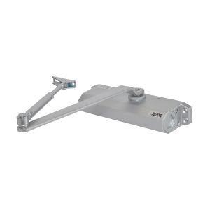 Дверний доводчик; конструкція тяги – складаний важіль; маса дверного полотна 25-150 кг; функція утримання дверей у відчиненому положенні під кутом 85°; розміри 250 / 46 / 67 мм; колір срібний