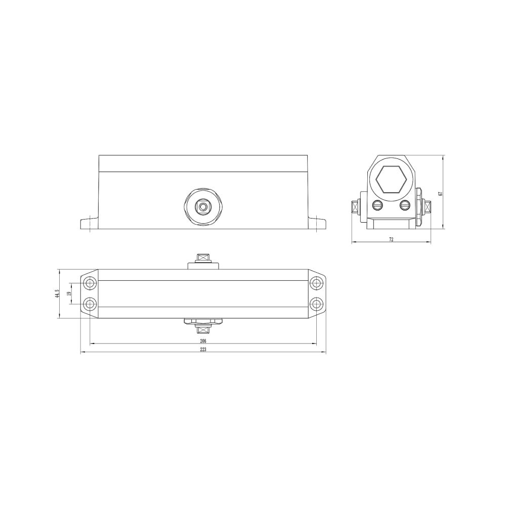 Дверний доводчик; конструкція тяги – складаний важіль; маса дверного полотна 65-85 кг; розміри 223 / 45 / 72 мм; колір білий