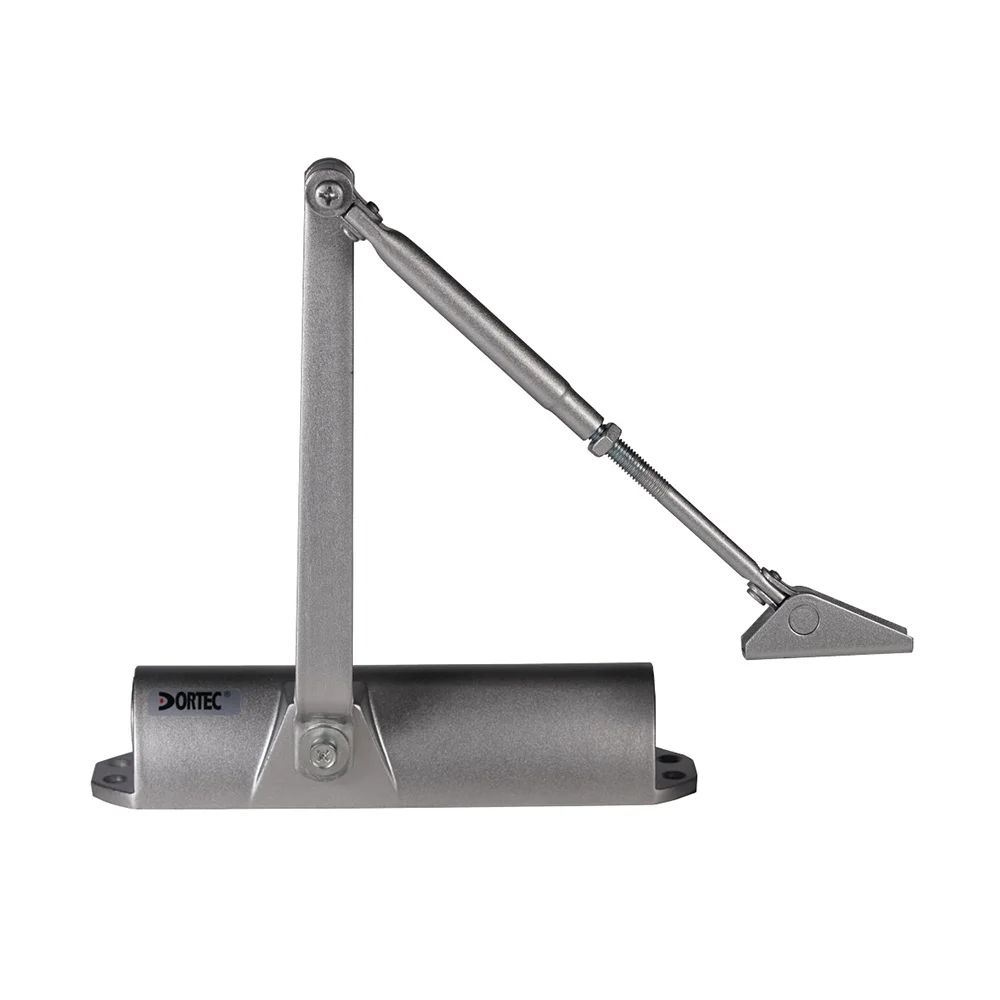 Дверний доводчик; конструкція тяги – складаний важіль; маса дверного полотна 45-65 кг; розміри 220 / 56 / 46 мм; колір срібний