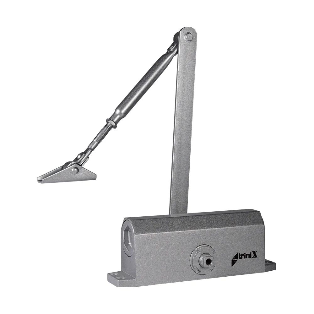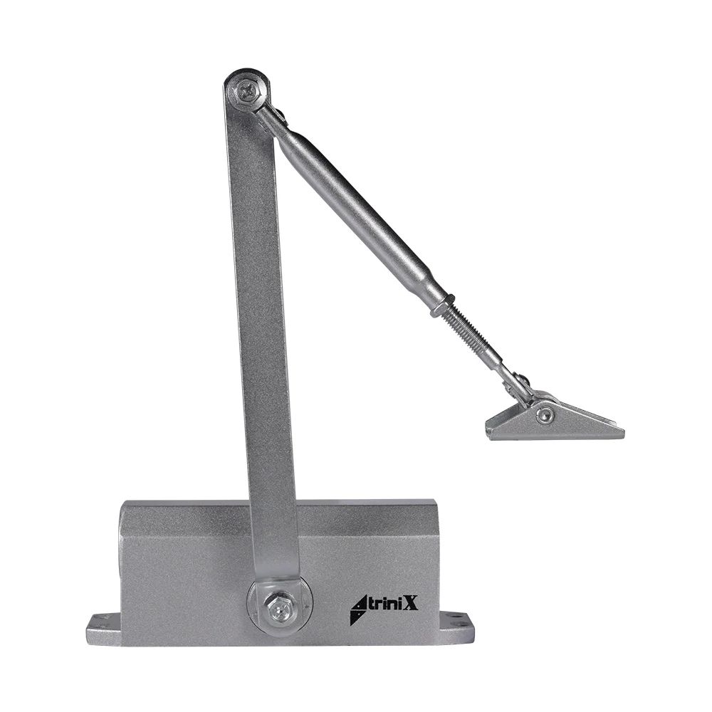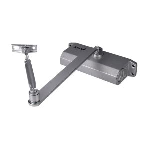 Дверний доводчик; конструкція тяги – складаний важіль; маса дверного полотна 45-65 кг; ширина дверей 950 мм; регулювання швидкості зачинення (від 180° до 15°) і дохлопу (від 15° до 0°); стійкий до морозу; розміри 174 / 63 / 63 мм; колір срібний