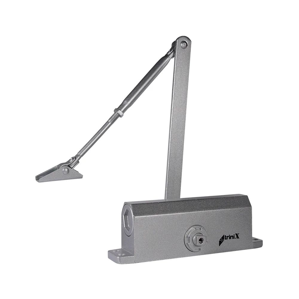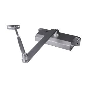 Дверний доводчик; конструкція тяги – складаний важіль; маса дверного полотна 60-85 кг; ширина дверей 1050 мм; регулювання швидкості зачинення (від 180° до 15°) і дохлопу (від 15° до 0°); стійкий до морозу; розміри 207 / 72 / 72 мм; колір срібний