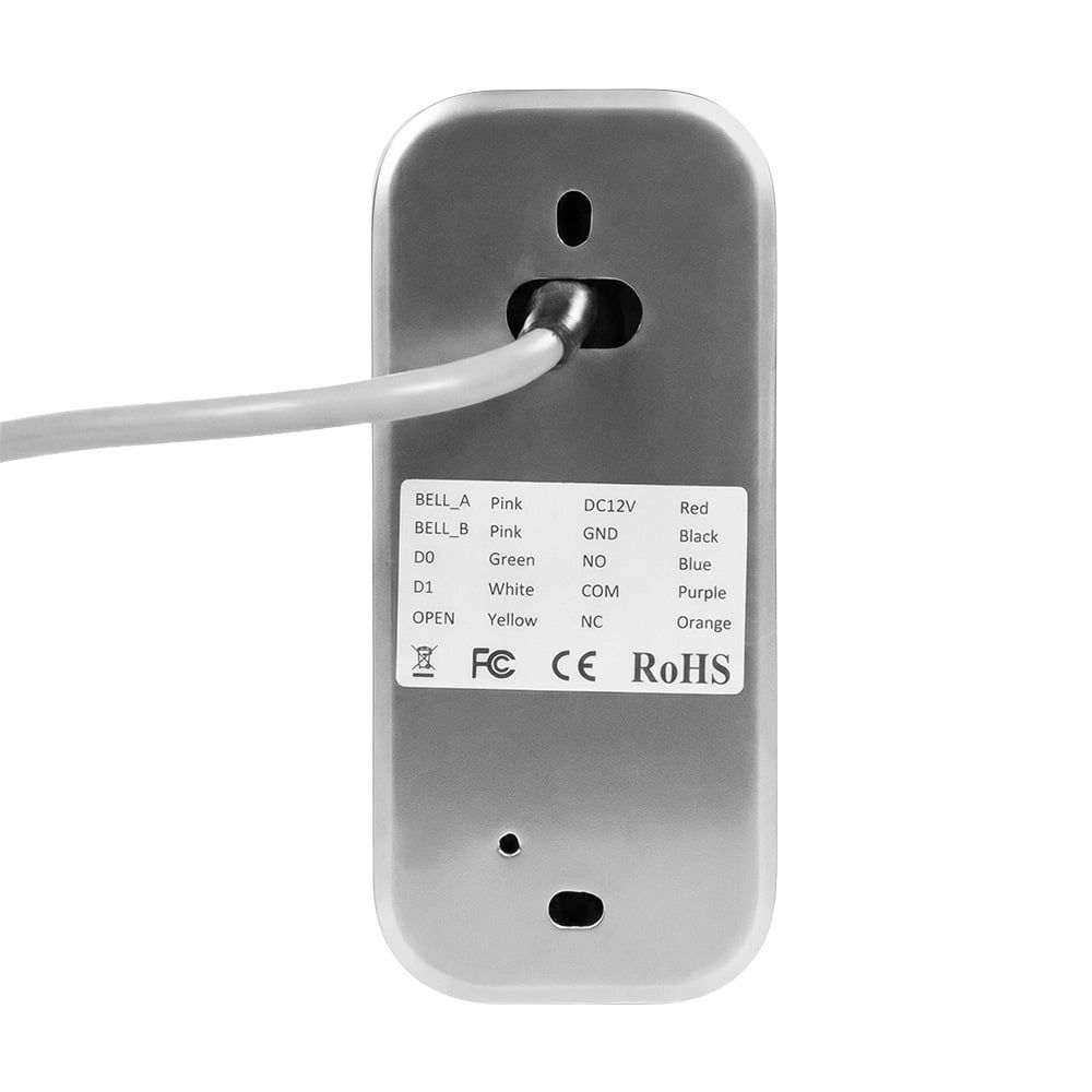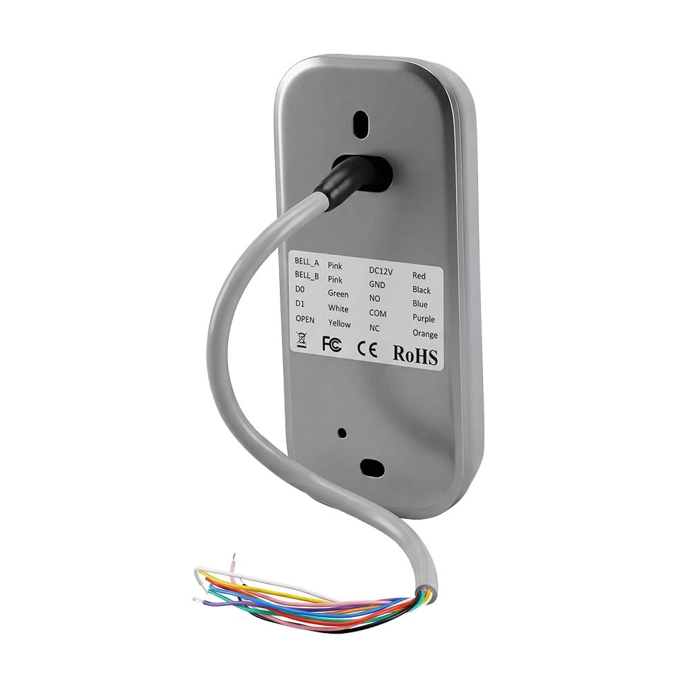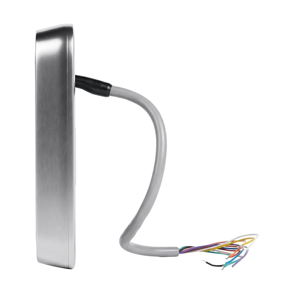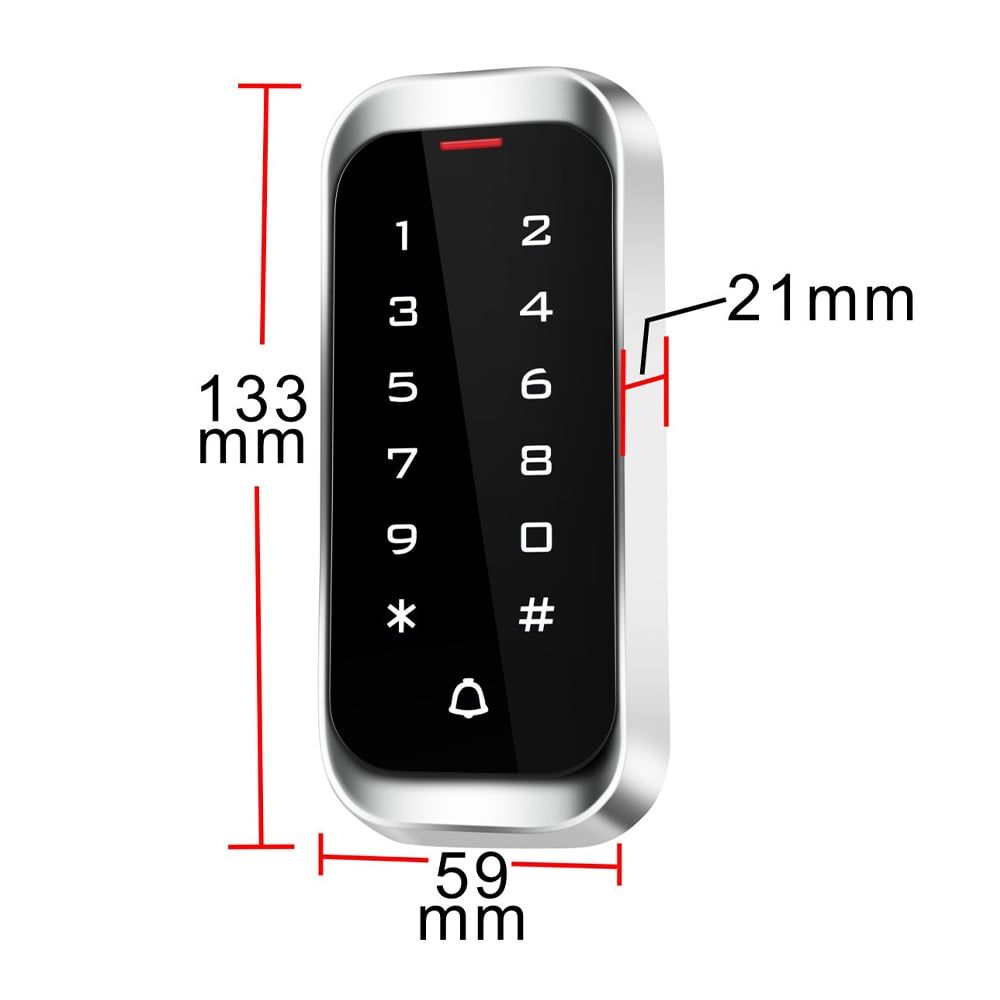 Автономна сенсорна клавіатура/контролер з вбудованим зчитувачем карток і брелоків EM-Marine, HID (125kHz) та Mifare (13.56MHz); дальність зчитування карт 2-6 см; одне реле (max 1А); інтерфейс Wiegand-26 – можна підключити додатковий зчитувач; контроль доступу: за кодом, картою або комбінації карта + код; пам’ять 2000 користувачів; підсвічування клавіатури; живлення DC 12 В, максимальне споживання струму 100 мА; металевий водонепроникний корпус; ступінь захисту IP68; робоча температура від -40˚C до +60˚C; розміри 133 / 59 / 21 мм
