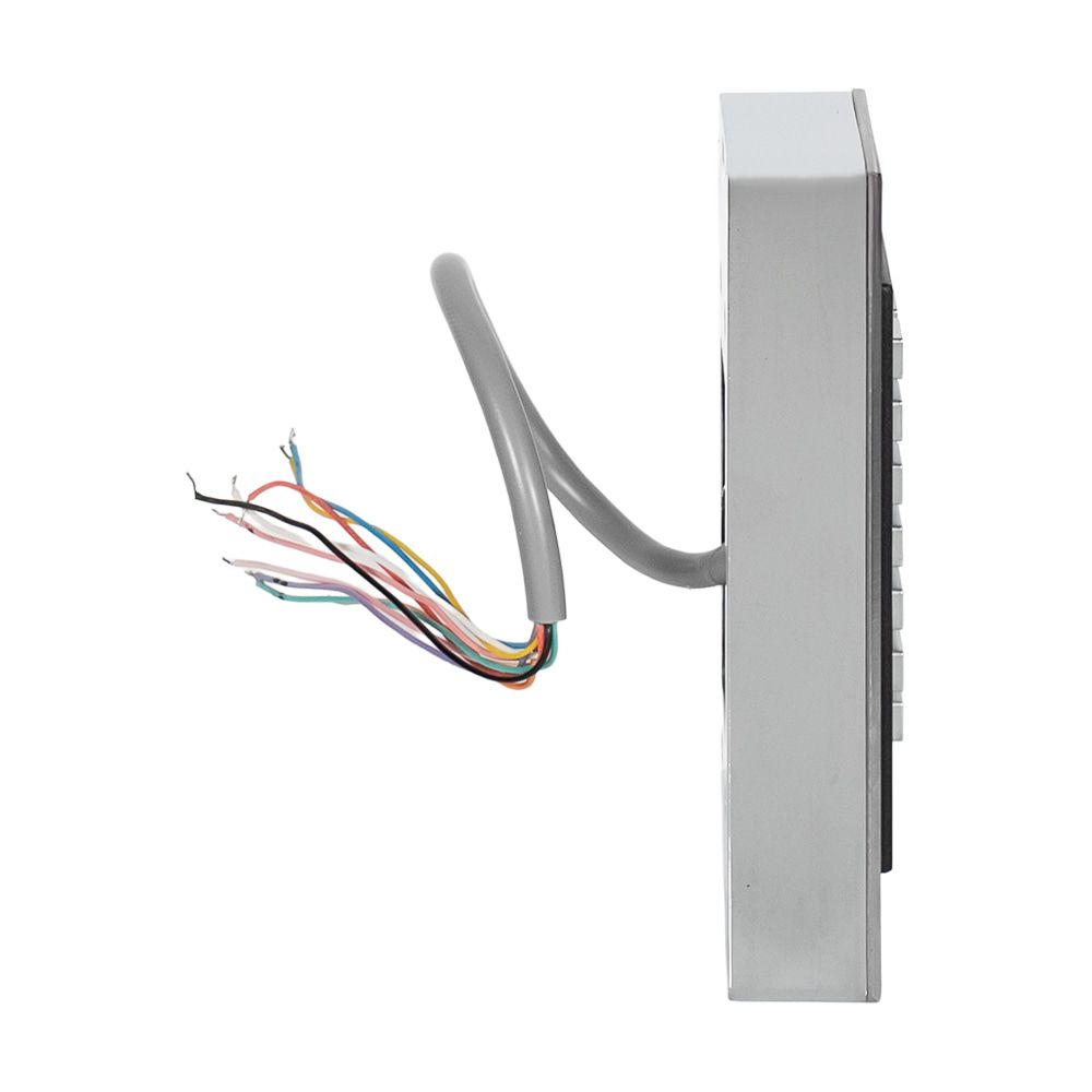 Кодова клавіатура з вбудованим зчитувачем карт та брелоків стандарту Mifare і контролером на 1 реле; кількість користувачів 2000; дальність зчитування до 5 см; робоча частота 13.56 МГц; інтерфейс Wiegand 26; струм комутації реле 1 А; регульований час відчинення дверей 0-99 с; індикація: звуковий сигнал, світлодіодна; живлення 12 В, споживання 30 мА; металевий корпус; зовнішнє встановлення, робоча температура -45°C~+60°C; ступінь захисту IP68; розміри 138 / 50 / 20 мм