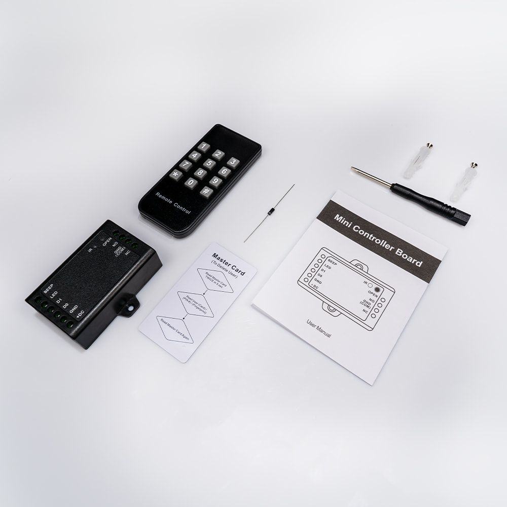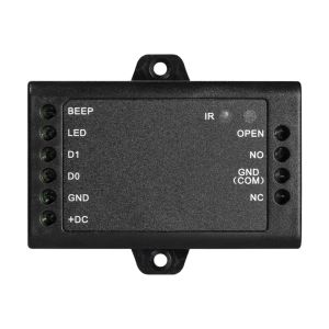 Міні-контролер для одних дверей; Wiegand інтерфейс 26~37 bits; контакти реле NO/NC; підтримка 1000 користувачів; ІЧ-пульт для програмування; імпульсний режим, безперервний режим, перемикання режимів; живлення DC 12 В; струм споживання 20 мА; діапазон робочих температур -20°С…+40°С; матеріал корпусу ударостійкий пластик; габаритні розміри 65 / 54 / 19 мм